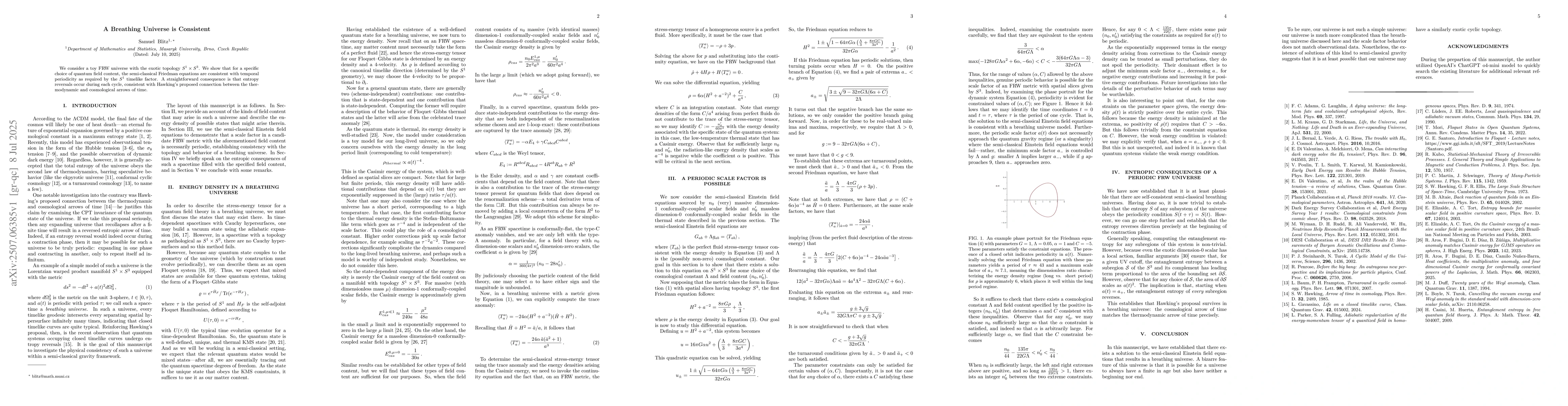 We consider a toy FRW universe with the exotic topology $S^1 \times S^3$. We show that for a specific choice of quantum field content, the semi-classical Friedman equations are consistent with temporal periodicity as required by the $S^1$ timelike factor. A straightforward consequence is that entropy reversals occur during each cycle, consistent with Hawking's proposed connection between the thermodynamic and cosmological arrows of time.