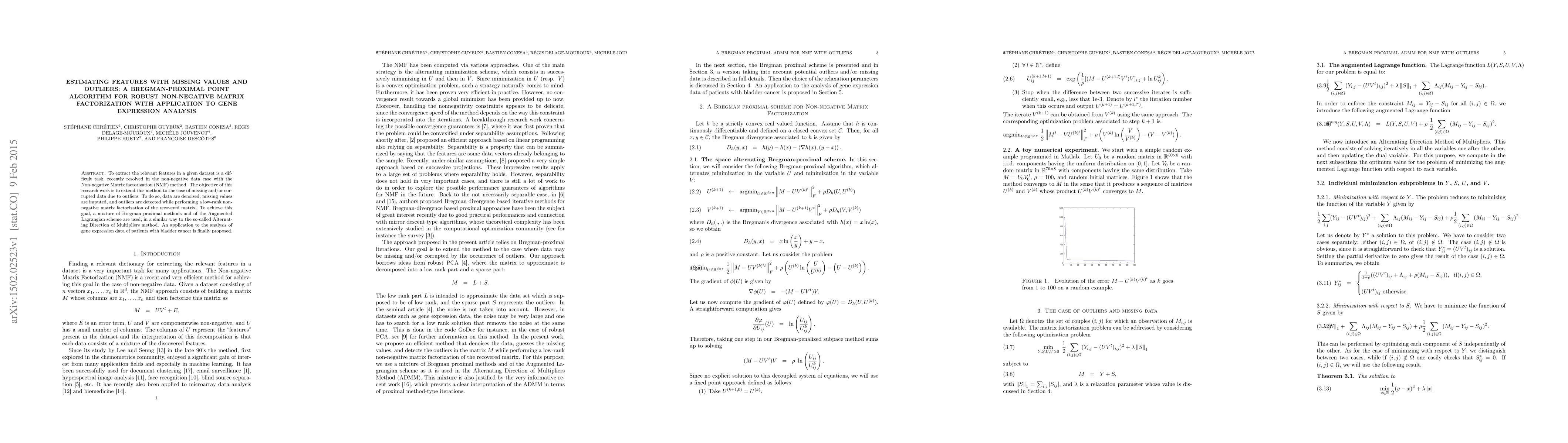 To extract the relevant features in a given dataset is a difficult task, recently resolved in the non-negative data case with the Non-negative Matrix factorization (NMF) method. The objective of this research work is to extend this method to the case of missing and/or corrupted data due to outliers. To do so, data are denoised, missing values are imputed, and outliers are detected while performing a low-rank non-negative matrix factorization of the recovered matrix. To achieve this goal, a mixture of Bregman proximal methods and of the Augmented Lagrangian scheme are used, in a similar way to the so-called Alternating Direction of Multipliers method. An application to the analysis of gene expression data of patients with bladder cancer is finally proposed.