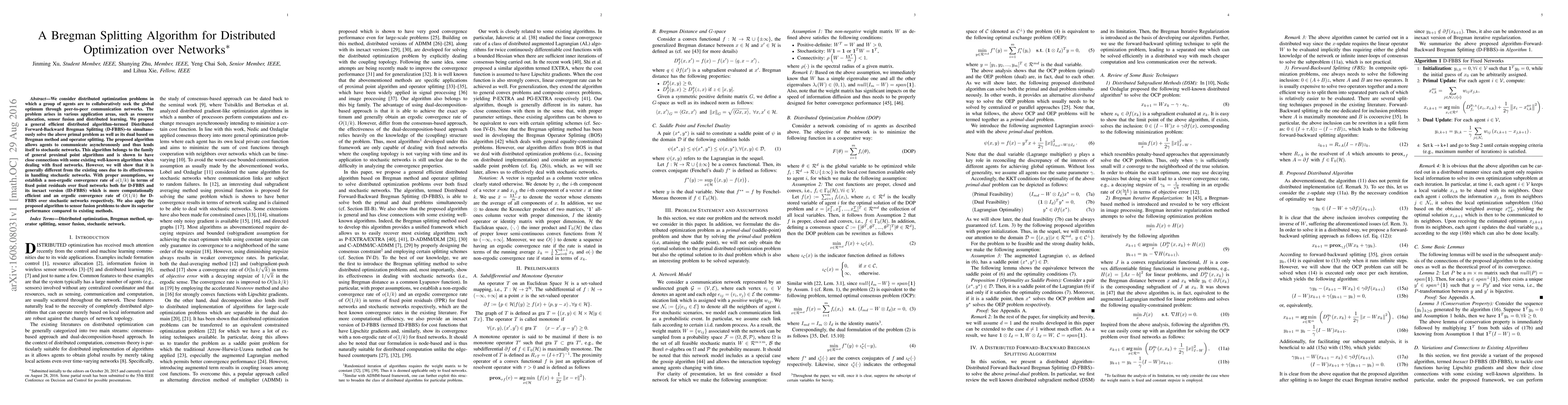 We consider distributed optimization problems in which a group of agents are to collaboratively seek the global optimum through peer-to-peer communication networks. The problem arises in various application areas, such as resource allocation, sensor fusion and distributed learning. We propose a general efficient distributed algorithm--termed Distributed Forward-Backward Bregman Splitting (D-FBBS)--to simultaneously solve the above primal problem as well as its dual based on Bregman method and operator splitting. The proposed algorithm allows agents to communicate asynchronously and thus lends itself to stochastic networks. This algorithm belongs to the family of general proximal point algorithms and is shown to have close connections with some existing well-known algorithms when dealing with fixed networks. However, we will show that it is generally different from the existing ones due to its effectiveness in handling stochastic networks. With proper assumptions, we establish a non-ergodic convergence rate of o(1/k) in terms of fixed point residuals over fixed networks both for D-FBBS and its inexact version (ID-FBBS) which is more computationally efficient and an ergodic convergence rate of O(1/k) for D-FBBS over stochastic networks respectively. We also apply the proposed algorithm to sensor fusion problems to show its superior performance compared to existing methods.
