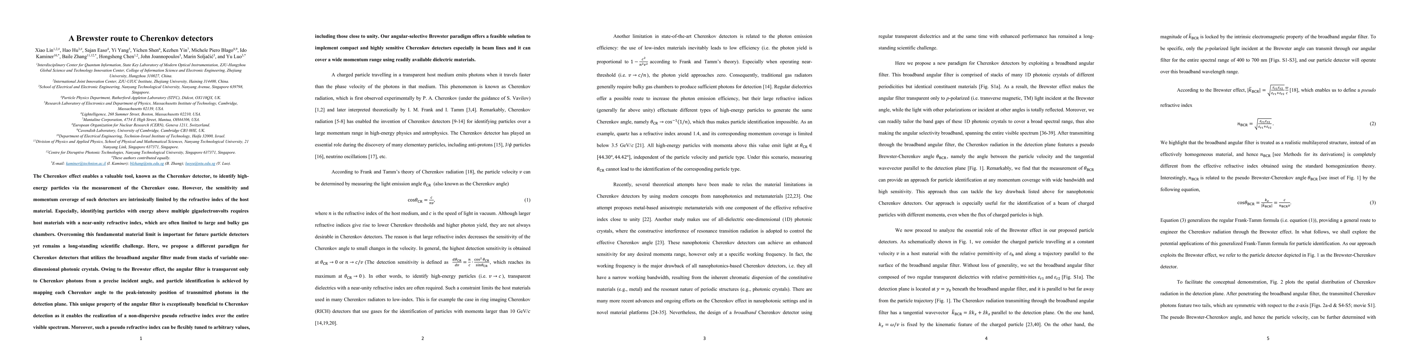 The Cherenkov effect enables a valuable tool, known as the Cherenkov detector, to identify high-energy particles via the measurement of the Cherenkov cone. However, the sensitivity and momentum coverage of such detectors are intrinsically limited by the refractive index of the host material. Especially, identifying particles with energy above multiple gigaelectronvolts requires host materials with a near-unity refractive index, which are often limited to large and bulky gas chambers. Overcoming this fundamental material limit is important for future particle detectors yet remains a long-standing scientific challenge. Here, we propose a different paradigm for Cherenkov detectors that utilizes the broadband angular filter made from stacks of variable one-dimensional photonic crystals. Owing to the Brewster effect, the angular filter is transparent only to Cherenkov photons from a precise incident angle, and particle identification is achieved by mapping each Cherenkov angle to the peak-intensity position of transmitted photons in the detection plane. This unique property of the angular filter is exceptionally beneficial to Cherenkov detection as it enables the realization of a non-dispersive pseudo refractive index over the entire visible spectrum. Moreover, such a pseudo refractive index can be flexibly tuned to arbitrary values, including those close to unity. Our angular-selective Brewster paradigm offers a feasible solution to implement compact and highly sensitive Cherenkov detectors especially in beam lines and it can cover a wide momentum range using readily available dielectric materials.