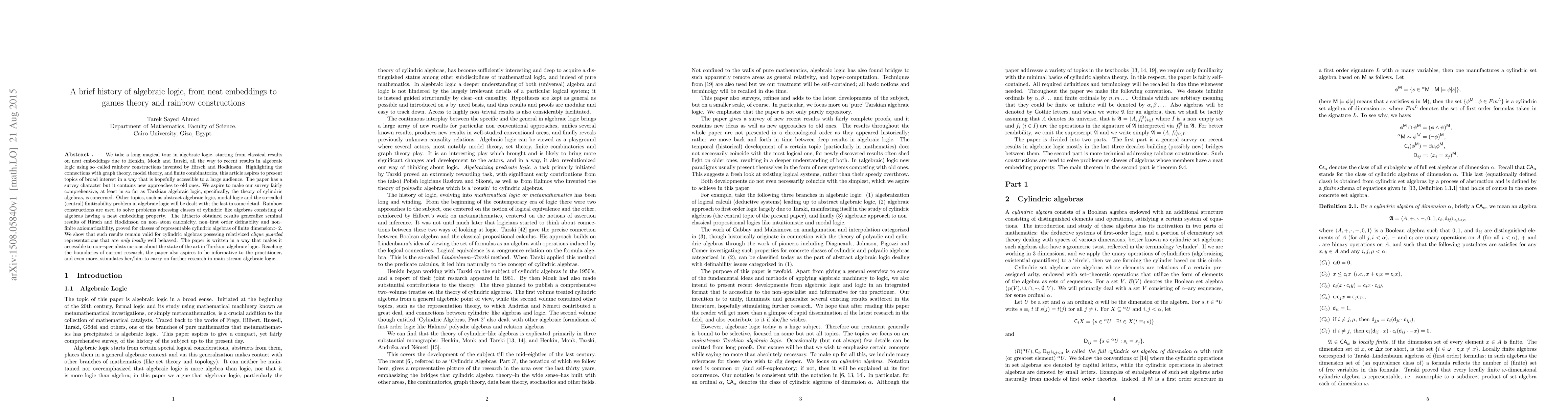 This paper provides a comprehensive survey of algebraic logic, tracing its evolution from classical neat embeddings to modern rainbow constructions, highlighting connections with graph theory, model theory, and finite combinatorics. It introduces new approaches to old problems, particularly focusing on cylindric algebras and their applications, aiming to be both accessible and informative to a broad audience.