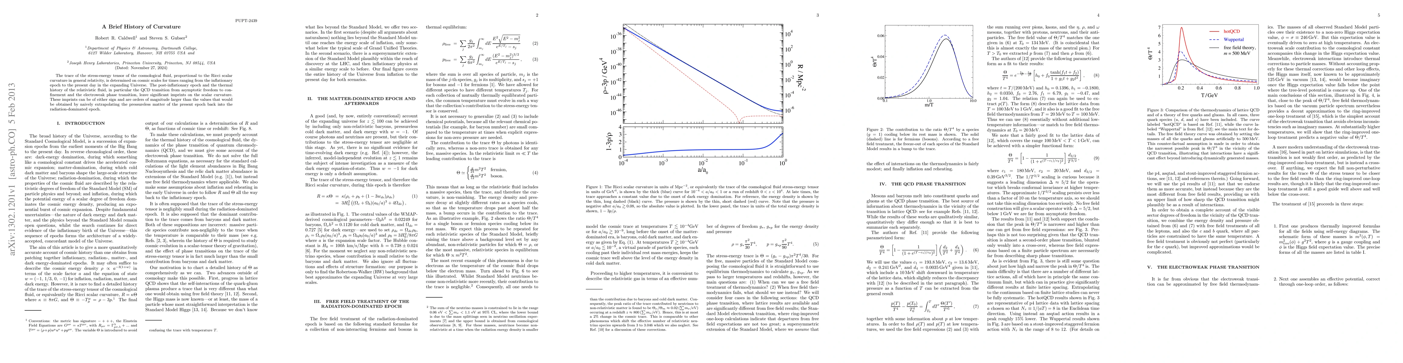 The trace of the stress-energy tensor of the cosmological fluid, proportional to the Ricci scalar curvature in general relativity, is determined on cosmic scales for times ranging from the inflationary epoch to the present day in the expanding Universe. The post-inflationary epoch and the thermal history of the relativistic fluid, in particular the QCD transition from asymptotic freedom to confinement and the electroweak phase transition, leave significant imprints on the scalar curvature. These imprints can be of either sign and are orders of magnitude larger than the values that would be obtained by naively extrapolating the pressureless matter of the present epoch back into the radiation-dominated epoch.