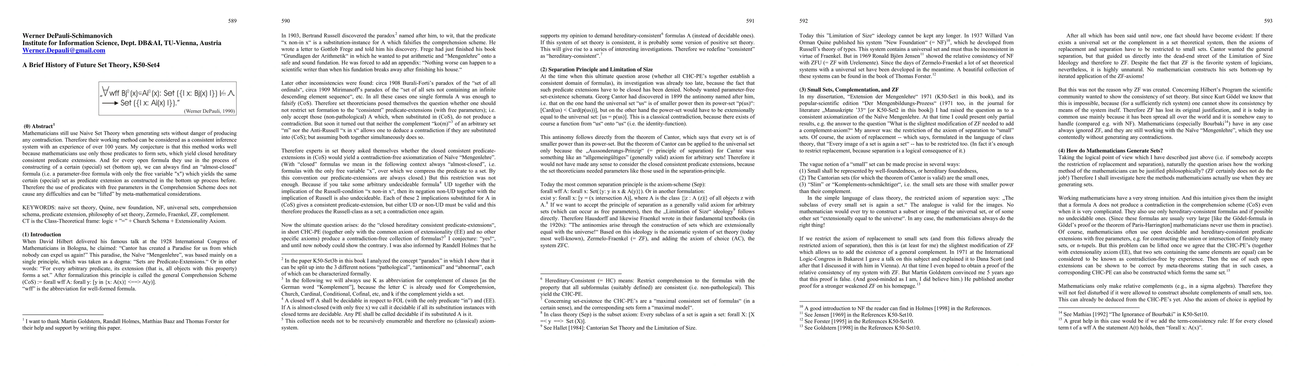 Mathematicians still use Naive Set Theory when generating sets without danger of producing any contradiction. Therefore their working method can be considered as a consistent inference system with an experience of over 100 years. My conjecture is that this method works well because mathematicians use only those predicates to form sets, which yield closed hereditary consistent predicate extensions. And for every open formula they use in the process of constructing of a certain (special) set (bottom up), we can always find an "almost-closed" formula (i.e. a parameter-free formula with only the free variable "x") which yields the same certain (special) set as predicate extension as constructed in the bottom up process before. Therefore the use of predicates with free parameters in the Comprehension Scheme does not cause any difficulties and can be "lifted" by meta-mathematical considerations. KEYWORDS: naive set theory, Quine, new foundation, NF, universal sets, comprehension schema, predicate extension, philosophy of set theory, Zermelo, Fraenkel, ZF, complement. CT is the Class-Theoretical frame: logic + "=" + Church Schema + Extensionality Axiom.