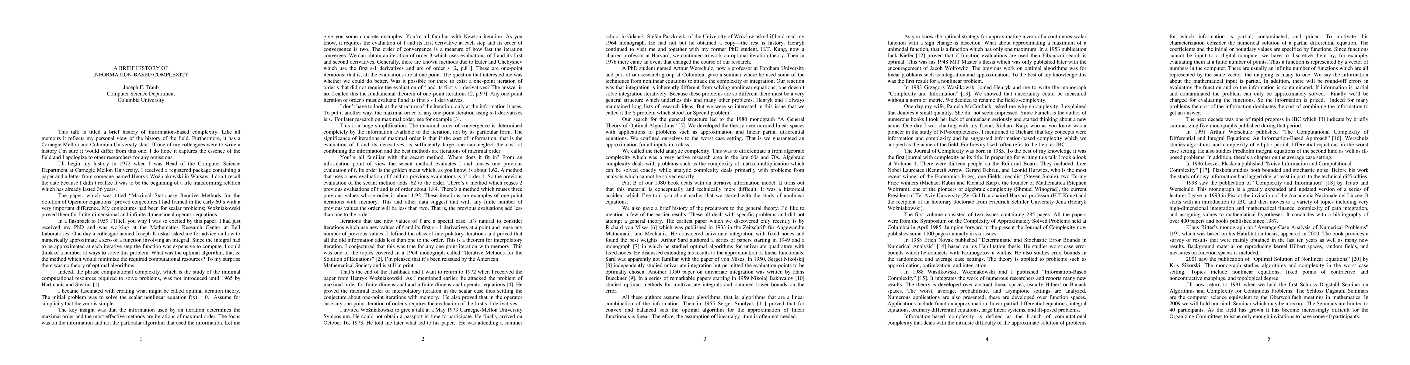 This paper was presented on the occasion of an honorary doctoral degree for Henryk Wozniakowski at Friedrich Schiller University in Jena, Germany on June 6, 2008. Information-based complexity (IBC) is the study of algorithms and computational complexity of continuous problems. Examples of such problems include partial differential equations (in particular, the Schrodinger equation) very high dimensional integration, approximation, continuous optimization, and path integration. Because the computer has only partial information about the continuous mathematical problem adversary arguments at the information level often lead to tight complexity bounds. This may be contrasted with discrete problems where only conjectures that the complexity hierarchy does not collapse are available. This paper discusses precursors to IBC. It reports on the beginning of optimal iteration theory in the early 60s which was published in Traub's 1964 monograph. In the 70s Traub and Wozniakowski began to formulate the foundations of IBC leading to their 1980 monograph. The paper continues with the development of IBC to the present.