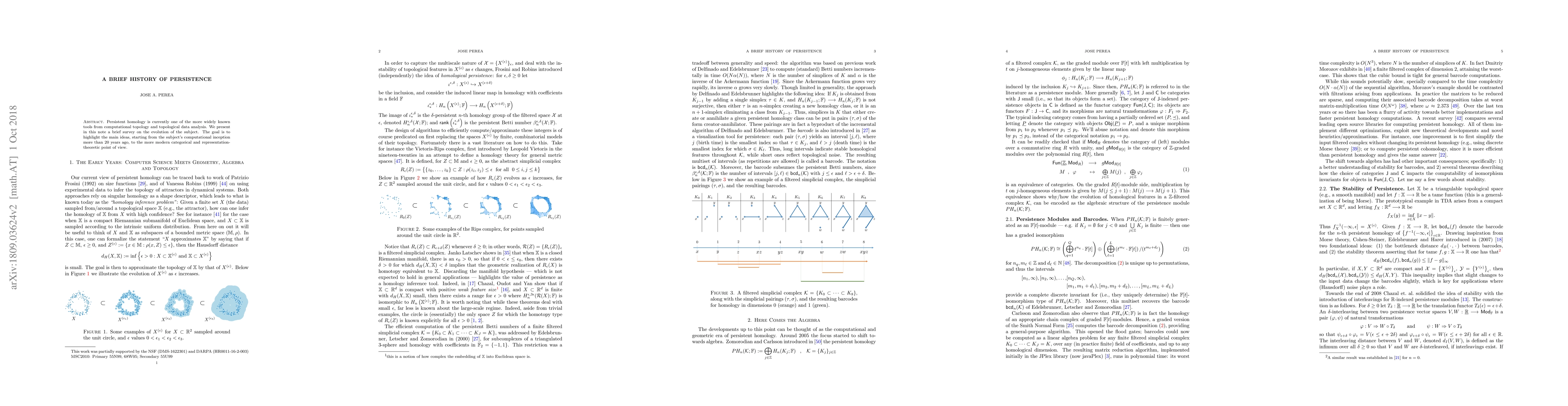 Persistent homology is currently one of the more widely known tools from computational topology and topological data analysis. We present in this note a brief survey on the evolution of the subject. The goal is to highlight the main ideas, starting from the subject's computational inception more than 20 years ago, to the more modern categorical and representation-theoretic point of view.