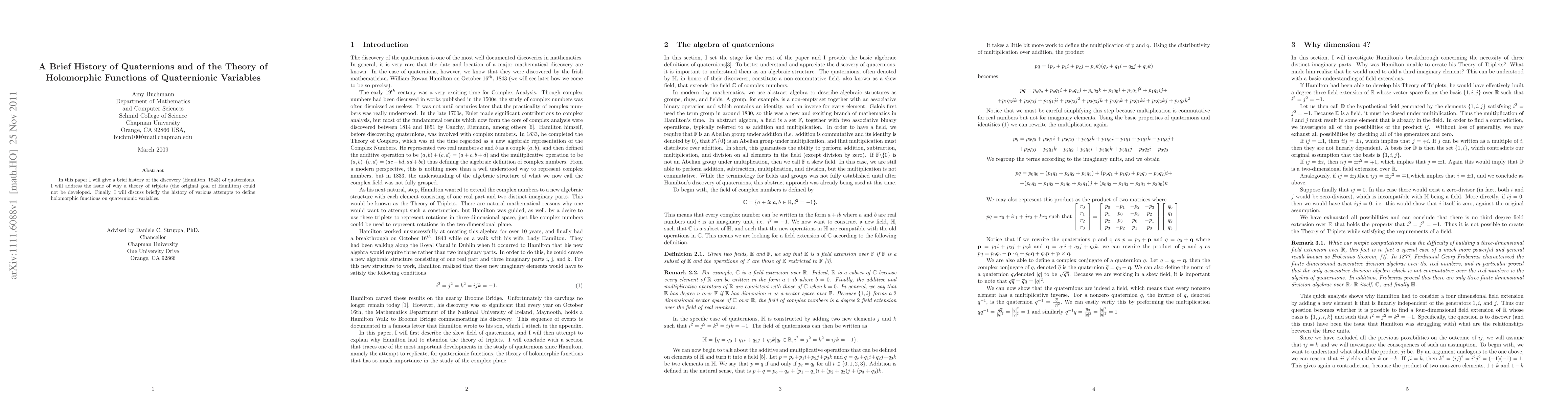 In this paper I will give a brief history of the discovery (Hamilton, 1843) of quaternions. I will address the issue of why a theory of triplets (the original goal of Hamilton) could not be developed. Finally, I will discuss briefly the history of various attempts to define holomorphic functions on quaternionic variables.