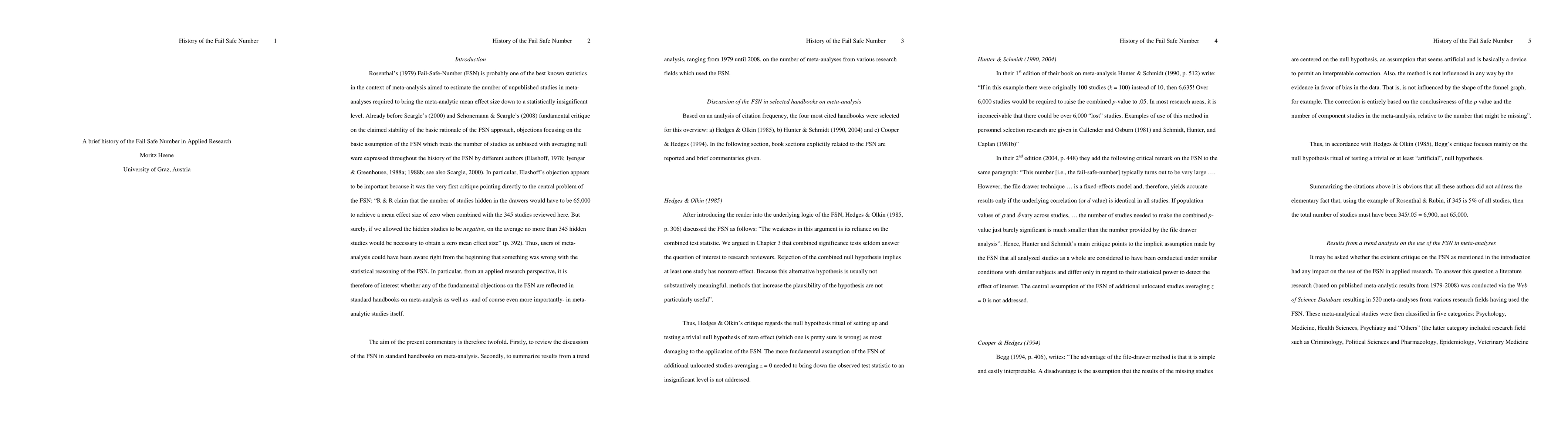 Rosenthal's (1979) Fail-Safe-Number (FSN) is probably one of the best known statistics in the context of meta-analysis aimed to estimate the number of unpublished studies in meta-analyses required to bring the meta-analytic mean effect size down to a statistically insignificant level. Already before Scargle's (2000) and Schonemann & Scargle's (2008) fundamental critique on the claimed stability of the basic rationale of the FSN approach, objections focusing on the basic assumption of the FSN which treats the number of studies as unbiased with averaging null were expressed throughout the history of the FSN by different authors (Elashoff, 1978; Iyengar & Greenhouse, 1988a; 1988b; see also Scargle, 2000). In particular, Elashoff's objection appears to be important because it was the very first critique pointing directly to the central problem of the FSN: "R & R claim that the number of studies hidden in the drawers would have to be 65,000 to achieve a mean effect size of zero when combined with the 345 studies reviewed here. But surely, if we allowed the hidden studies to be negative, on the average no more than 345 hidden studies would be necessary to obtain a zero mean effect size" (p. 392). Thus, users of meta-analysis could have been aware right from the beginning that something was wrong with the statistical reasoning of the FSN. In particular, from an applied research perspective, it is therefore of interest whether any of the fundamental objections on the FSN are reflected in standard handbooks on meta-analysis as well as -and of course even more importantly- in meta-analytic studies itself.