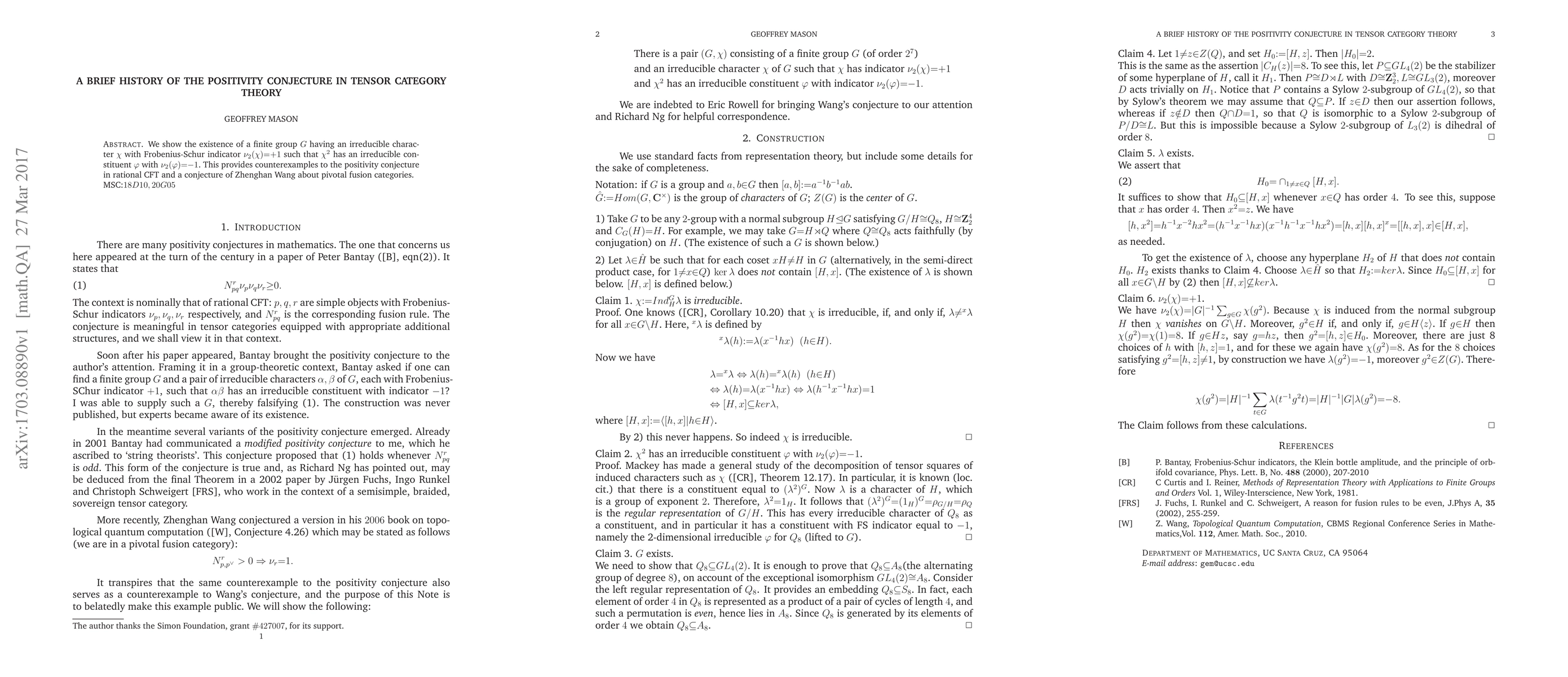 We show the existence of a finite group $G$ having an irreducible character $\chi$ with Frobenius-Schur indicator $\nu_2(\chi){=}{+}1$ such that $\chi^2$ has an irreducible constituent $\varphi$ with $\nu_2(\varphi){=}{-}1$. This provides counterexamples to the positivity conjecture in rational CFT and a conjecture of Zhenghan Wang about pivotal fusion categories.