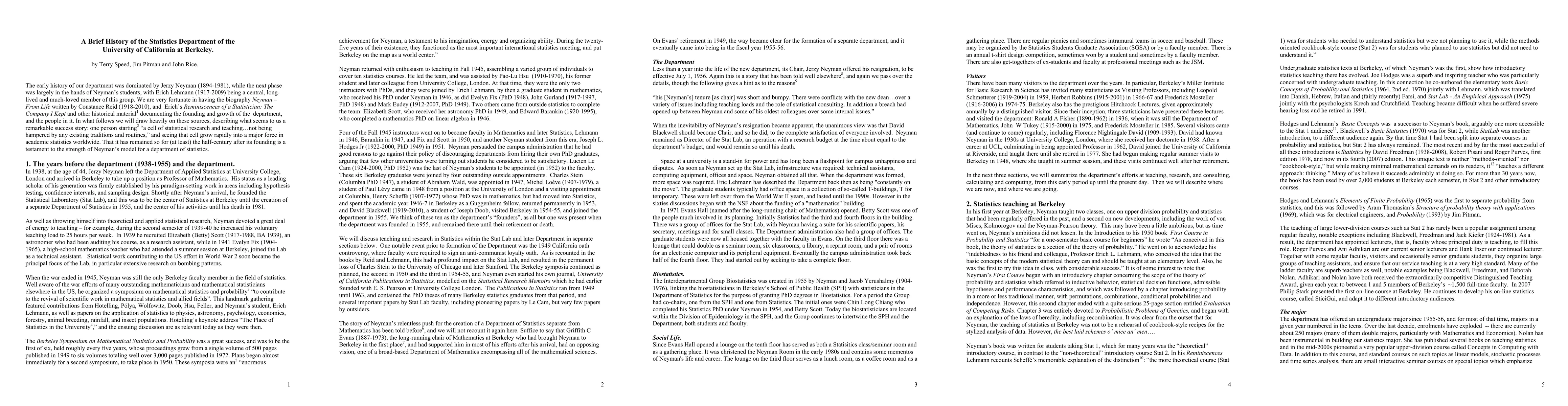 The early history of our department was dominated by Jerzy Neyman (1894-1981), while the next phase was largely in the hands of Neyman's students, with Erich Lehmann (1917-2009) being a central, long-lived and much-loved member of this group. We are very fortunate in having Constance Reid's biography "Neyman -- From Life" and Erich's "Reminiscences of a Statistician: The Company I Kept" and other historical material documenting the founding and growth of the department, and the people in it. In what follows, we will draw heavily from these sources, describing what seems to us to be a remarkable success story: one person starting "a cell of statistical research and teaching ... not being hampered by any existing traditions and routines" and seeing that cell grow rapidly into a major force in academic statistics worldwide. That it has remained so for (at least) the half-century after its founding is a testament to the strength of Neyman's model for a department of statistics.