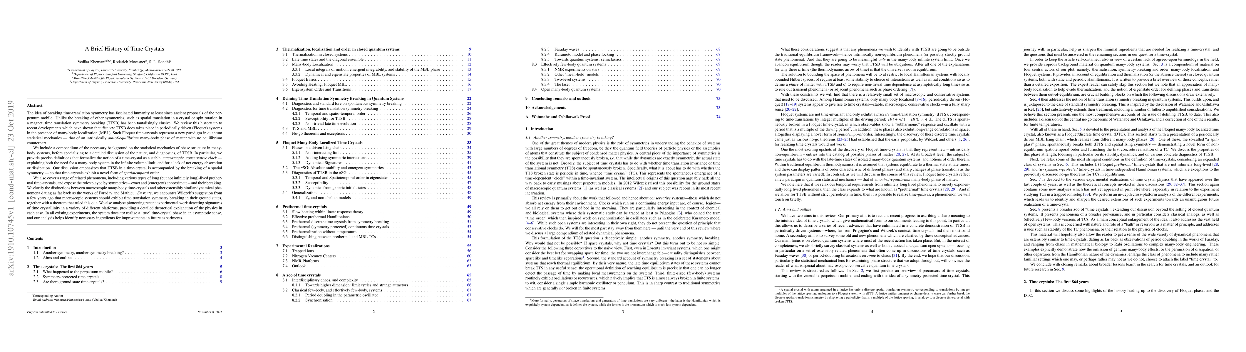 The idea of breaking time-translation symmetry has fascinated humanity at least since ancient proposals of the perpetuum mobile. Unlike the breaking of other symmetries, such as spatial translation in a crystal or spin rotation in a magnet, time translation symmetry breaking (TTSB) has been tantalisingly elusive. We review this history up to recent developments which have shown that discrete TTSB does takes place in periodically driven (Floquet) systems in the presence of many-body localization. Such Floquet time-crystals represent a new paradigm in quantum statistical mechanics --- that of an intrinsically out-of-equilibrium many-body phase of matter. We include a compendium of necessary background, before specializing to a detailed discussion of the nature, and diagnostics, of TTSB. We formalize the notion of a time-crystal as a stable, macroscopic, conservative clock --- explaining both the need for a many-body system in the infinite volume limit, and for a lack of net energy absorption or dissipation. We also cover a range of related phenomena, including various types of long-lived prethermal time-crystals, and expose the roles played by symmetries -- exact and (emergent) approximate -- and their breaking. We clarify the distinctions between many-body time-crystals and other ostensibly similar phenomena dating as far back as the works of Faraday and Mathieu. En route, we encounter Wilczek's suggestion that macroscopic systems should exhibit TTSB in their ground states, together with a theorem ruling this out. We also analyze pioneering recent experiments detecting signatures of time crystallinity in a variety of different platforms, and provide a detailed theoretical explanation of the physics in each case. In all existing experiments, the system does not realize a `true' time-crystal phase, and we identify necessary ingredients for improvements in future experiments.