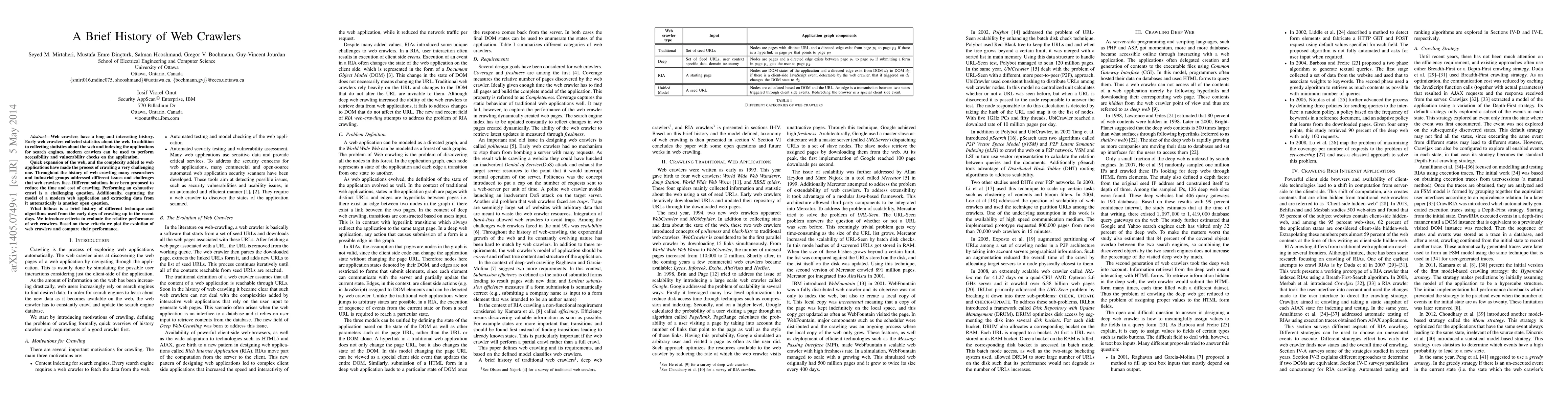 Web crawlers visit internet applications, collect data, and learn about new web pages from visited pages. Web crawlers have a long and interesting history. Early web crawlers collected statistics about the web. In addition to collecting statistics about the web and indexing the applications for search engines, modern crawlers can be used to perform accessibility and vulnerability checks on the application. Quick expansion of the web, and the complexity added to web applications have made the process of crawling a very challenging one. Throughout the history of web crawling many researchers and industrial groups addressed different issues and challenges that web crawlers face. Different solutions have been proposed to reduce the time and cost of crawling. Performing an exhaustive crawl is a challenging question. Additionally capturing the model of a modern web application and extracting data from it automatically is another open question. What follows is a brief history of different technique and algorithms used from the early days of crawling up to the recent days. We introduce criteria to evaluate the relative performance of web crawlers. Based on these criteria we plot the evolution of web crawlers and compare their performance