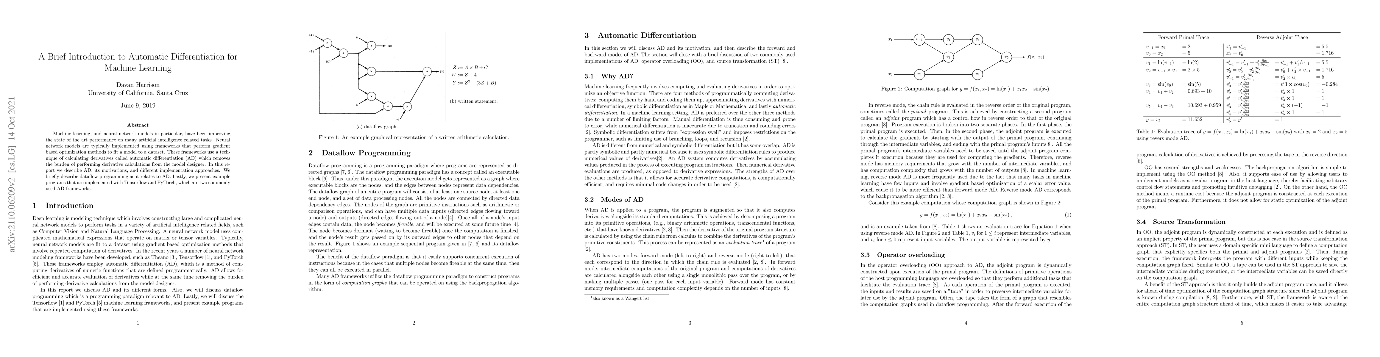 This paper introduces automatic differentiation (AD) as a technique used in machine learning to compute derivatives efficiently, enabling gradient-based optimization in neural networks. It discusses AD's motivations, implementation approaches, and briefly relates dataflow programming to AD, concluding with example programs in Tensorflow and PyTorch.