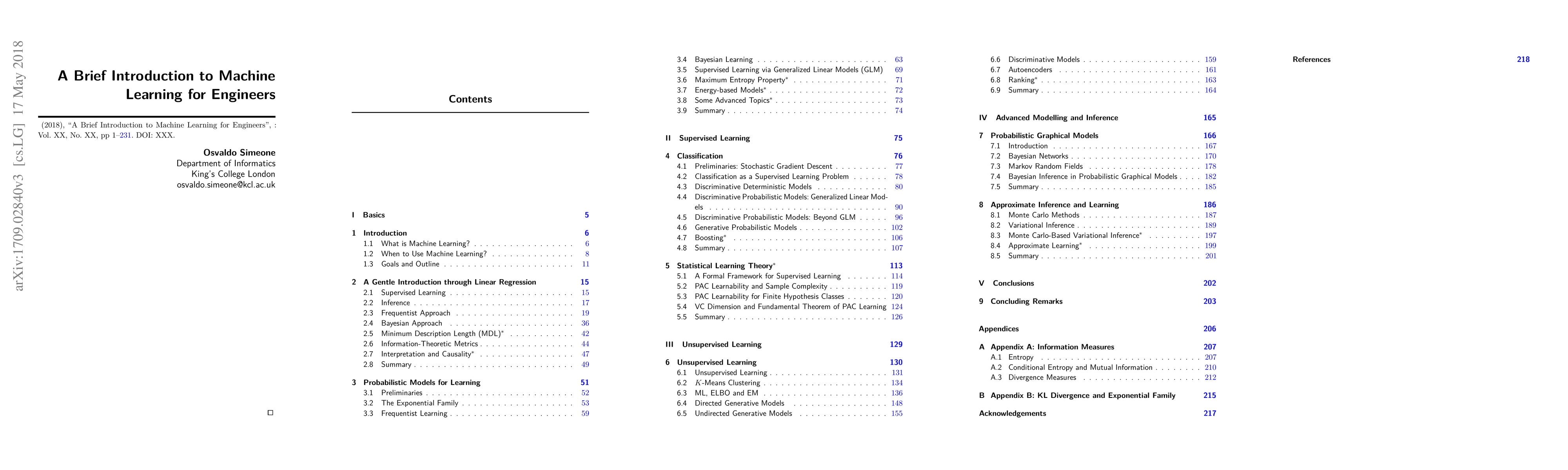 This monograph introduces machine learning concepts, algorithms, and theoretical results, focusing on probabilistic models for supervised and unsupervised learning, organized into discriminative and generative models, frequentist and Bayesian approaches, and exact and approximate inference. It serves as an entry point for engineers with a background in probability and linear algebra.