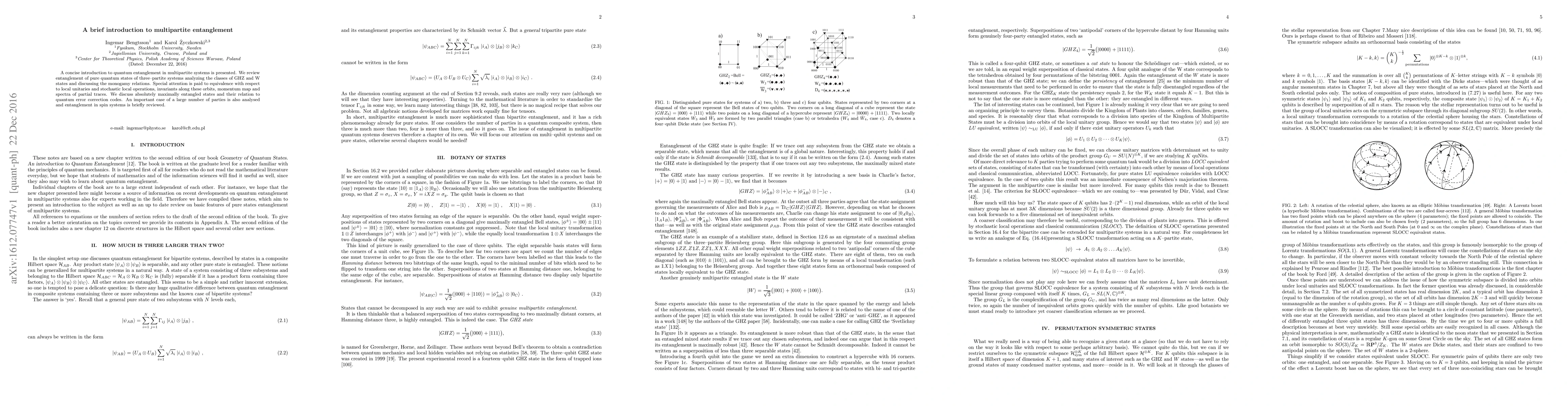 This paper introduces quantum entanglement in multipartite systems, focusing on three-partite GHZ and W states, and discusses their properties, invariants, and relevance to quantum error correction. It also explores entanglement in larger systems and spin systems.