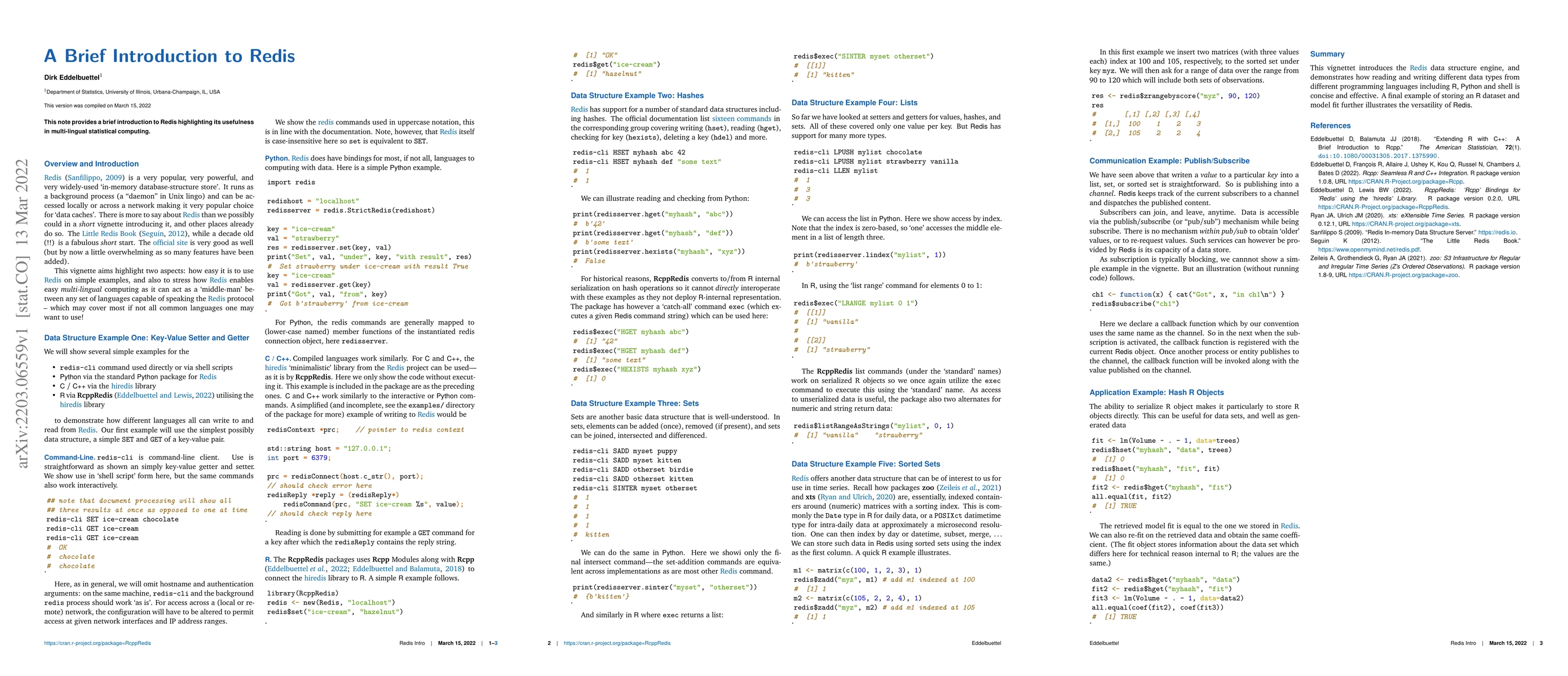 The paper provides a brief introduction to Redis, an in-memory data structure store, focusing on its utility in multi-lingual statistical computing. It demonstrates how to use Redis with simple examples across various programming languages including R, Python, C/C++, and shell.