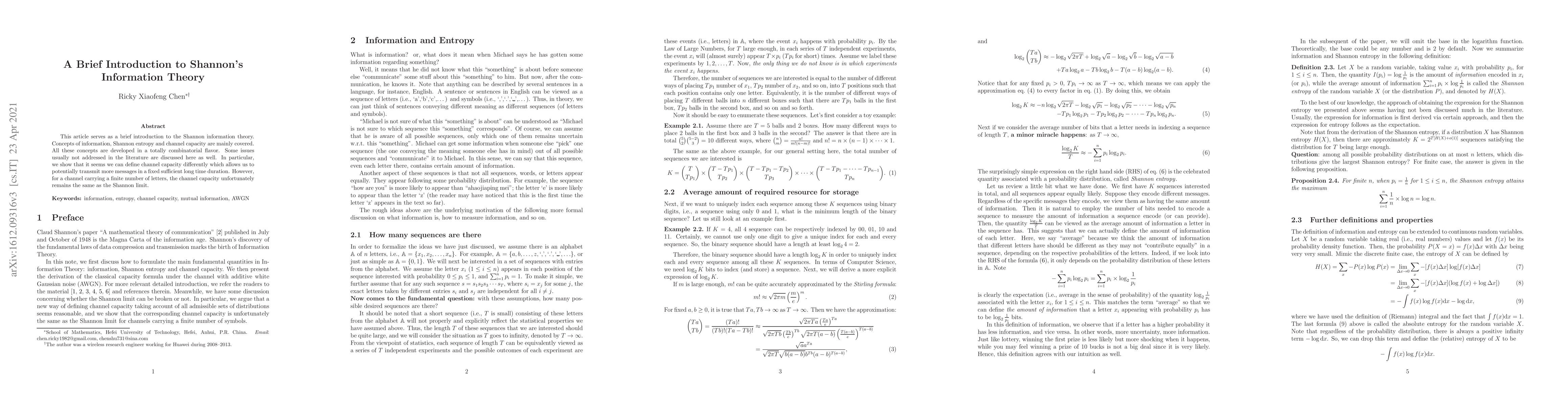 This paper introduces Shannon's information theory, focusing on concepts like information, Shannon entropy, and channel capacity in a combinatorial context. It proposes an alternative definition of channel capacity that may theoretically allow for more message transmission over time, though it confirms the traditional Shannon limit for finite channels.
