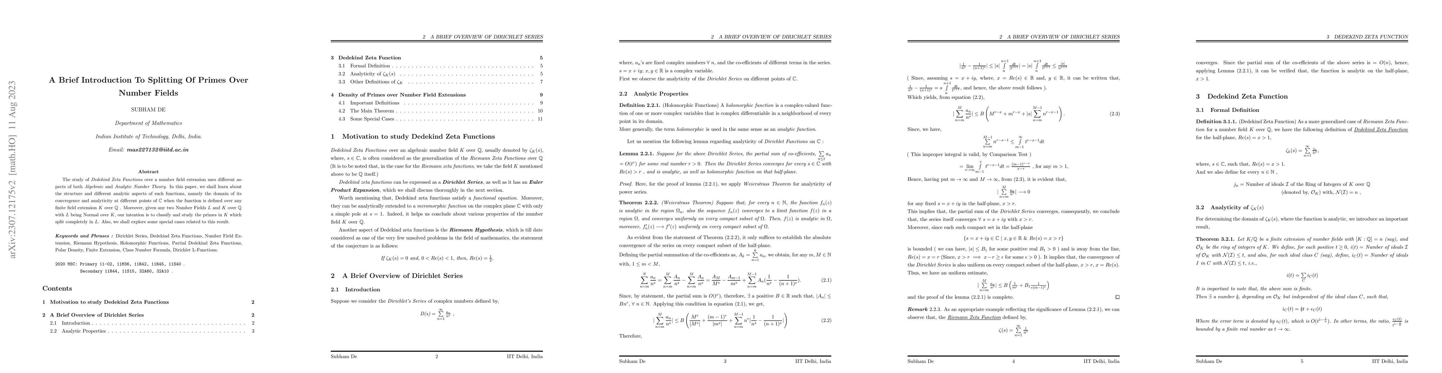 This paper investigates Dedekind Zeta Functions over number field extensions, focusing on their convergence and analyticity. It classifies primes in a number field \( K \) that split completely in a larger normal field \( L \) and explores special cases related to this phenomenon.