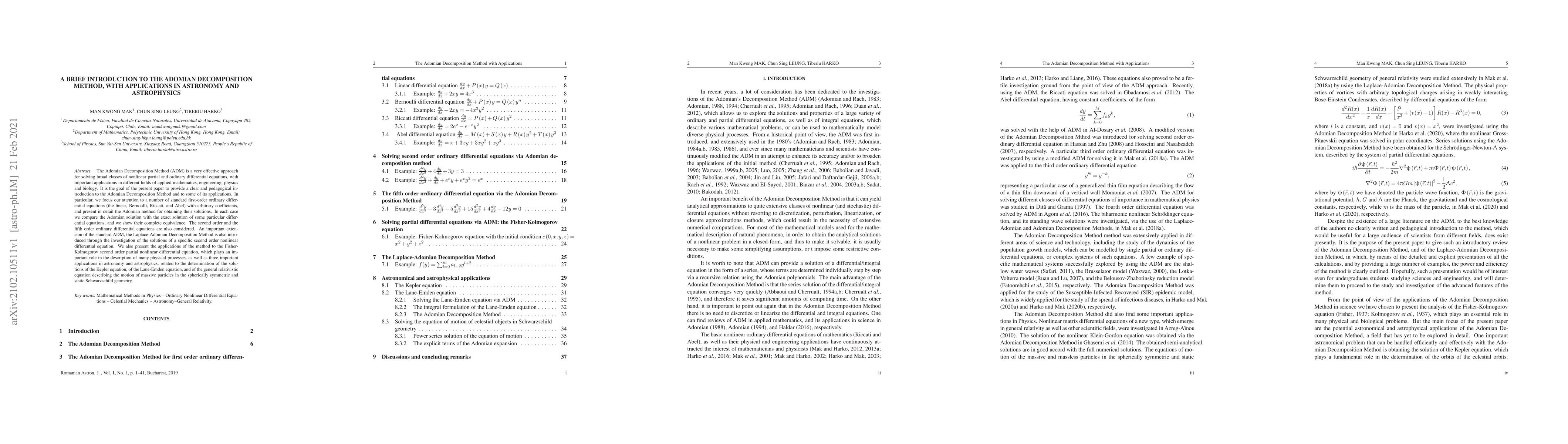 This paper provides a pedagogical introduction to the Adomian Decomposition Method (ADM) for solving nonlinear ordinary and partial differential equations, with applications in astronomy and astrophysics. It demonstrates the ADM's effectiveness through detailed solutions of various first-order ordinary differential equations and extends the method to second-order equations and the Fisher-Kolmogorov equation, highlighting its use in solving key equations in astrophysics.