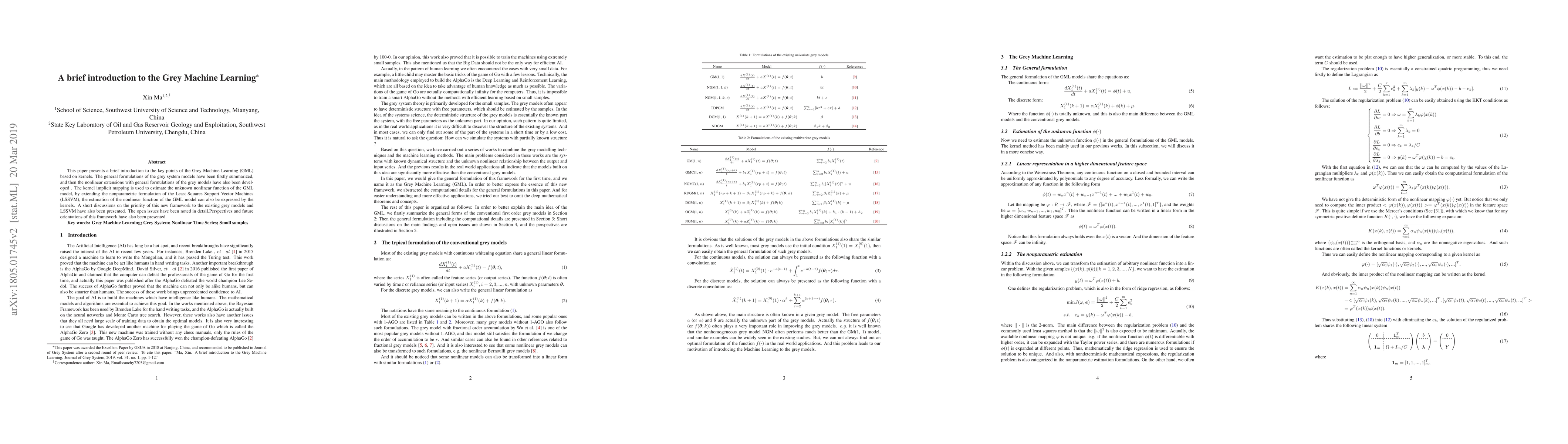 This paper presents a brief introduction to the key points of the Grey Machine Learning (GML) based on the kernels. The general formulation of the grey system models have been firstly summarized, and then the nonlinear extension of the grey models have been developed also with general formulations. The kernel implicit mapping is used to estimate the nonlinear function of the GML model, by extending the nonparametric formulation of the LSSVM, the estimation of the nonlinear function of the GML model can also be expressed by the kernels. A short discussion on the priority of this new framework to the existing grey models and LSSVM have also been discussed in this paper. And the perspectives and future orientations of this framework have also been presented.