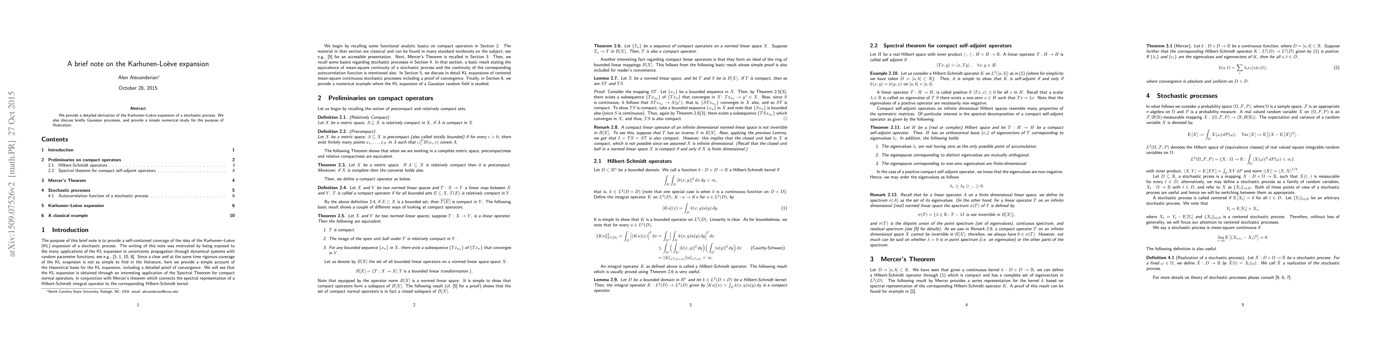 Summary: This paper derives the Karhunen-Loève expansion for stochastic processes, emphasizing the method's application to Gaussian processes. A numerical study is included to illustrate the theoretical concepts.