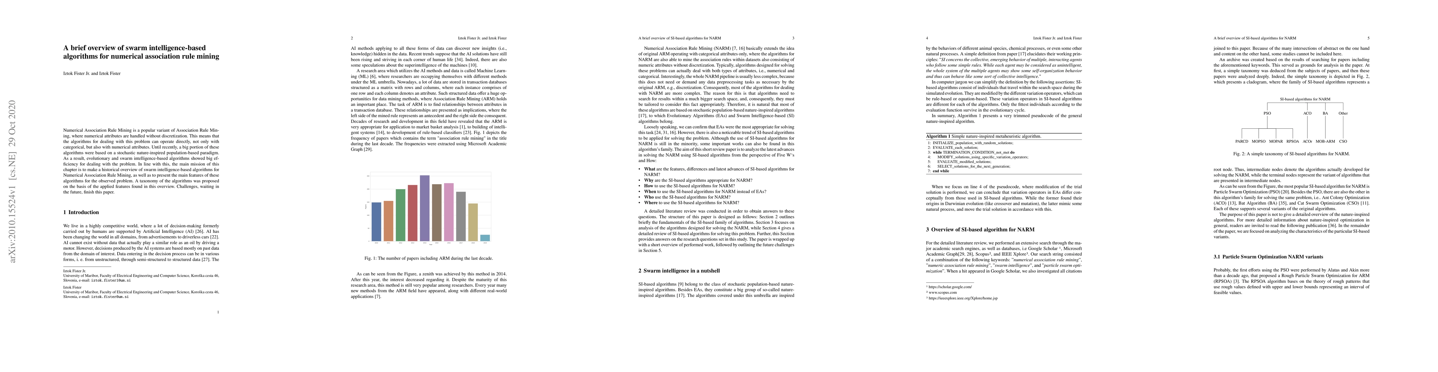This paper provides a historical overview of swarm intelligence-based algorithms for Numerical Association Rule Mining, highlighting their efficiency and main features. It also proposes a taxonomy of these algorithms and discusses future challenges.