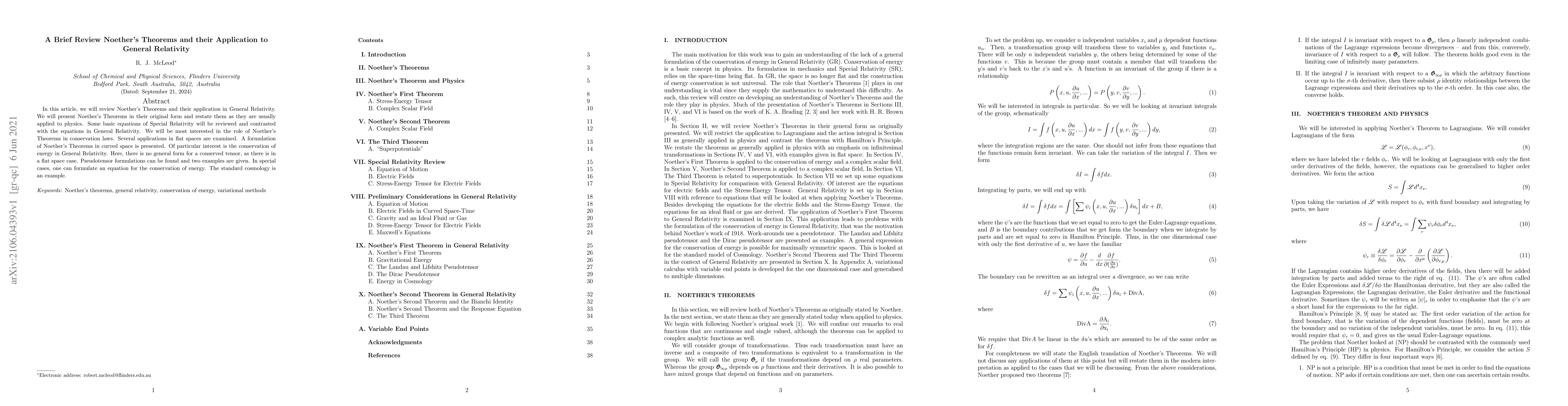 This paper reviews Noether's Theorems and their application to General Relativity, focusing on their role in conservation laws and the absence of a general conserved tensor in curved space, with pseudotensor formulations and special case examples discussed.