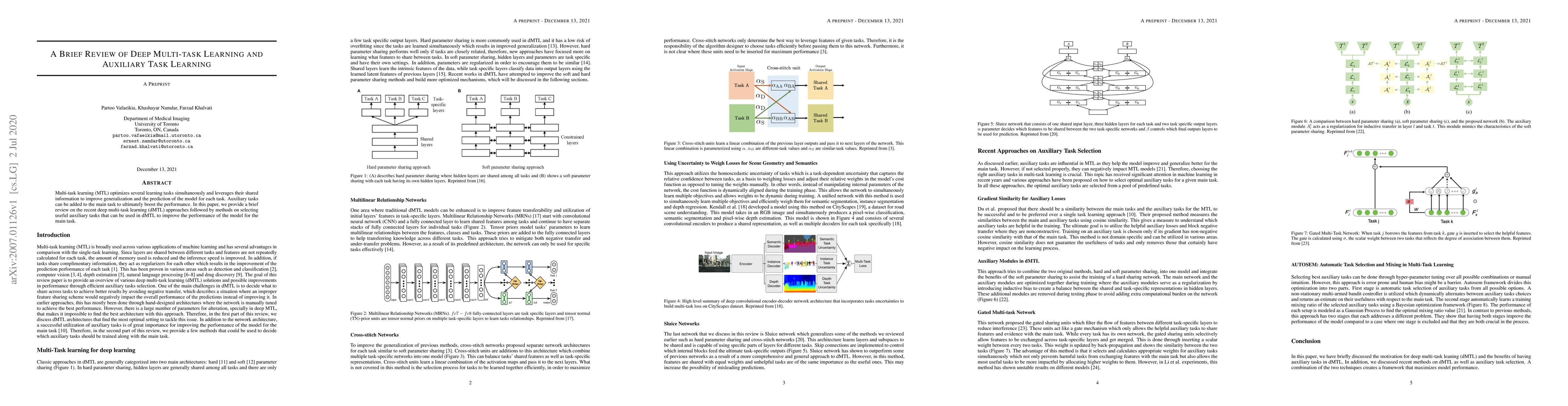This paper reviews recent deep multi-task learning (dMTL) approaches and discusses methods for selecting effective auxiliary tasks to enhance the performance of the main task by leveraging shared information across tasks.