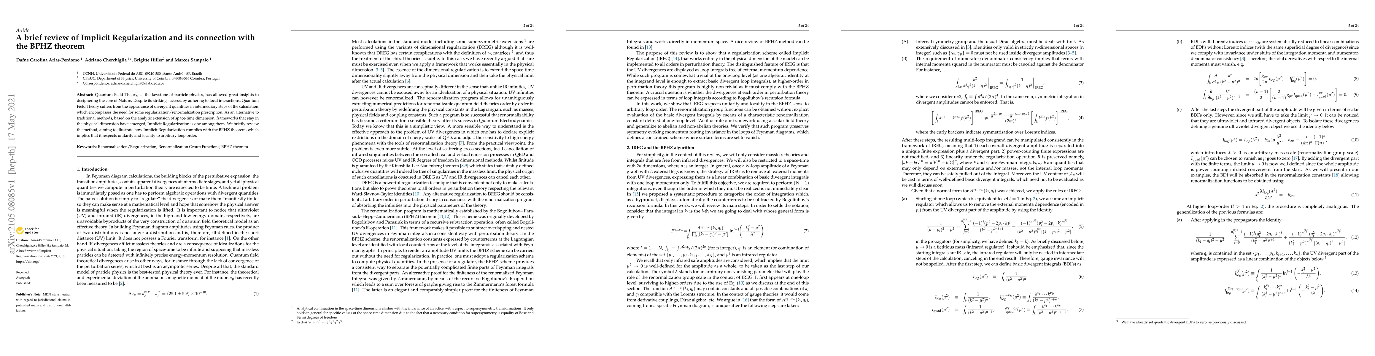 This paper reviews Implicit Regularization, a method that avoids traditional renormalization techniques by staying within the physical dimension. It demonstrates how Implicit Regularization aligns with the BPHZ theorem, ensuring respect for unitarity and locality at any loop order.