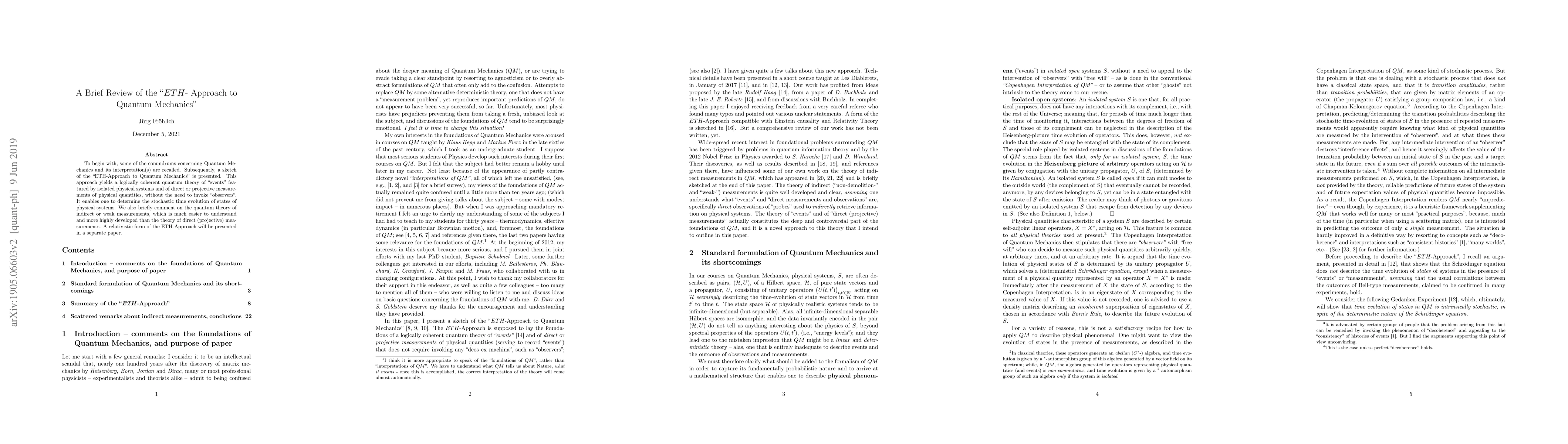 This paper reviews the "ETH-Approach to Quantum Mechanics," which offers a logically coherent theory of events and measurements without invoking observers, enabling the stochastic time evolution of physical systems. It also briefly discusses the more developed theory of indirect or weak measurements.