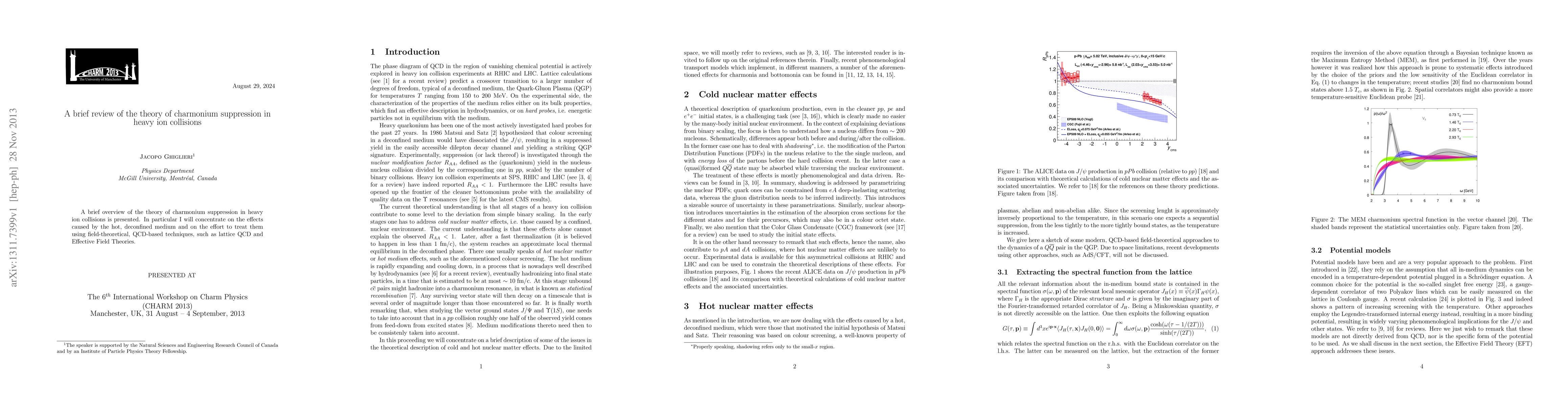 Summary: This paper provides an overview of the theory behind charmonium suppression in heavy ion collisions, focusing on the impact of the hot, deconfined medium and the application of QCD-based techniques like lattice QCD and Effective Field Theories to understand these effects.