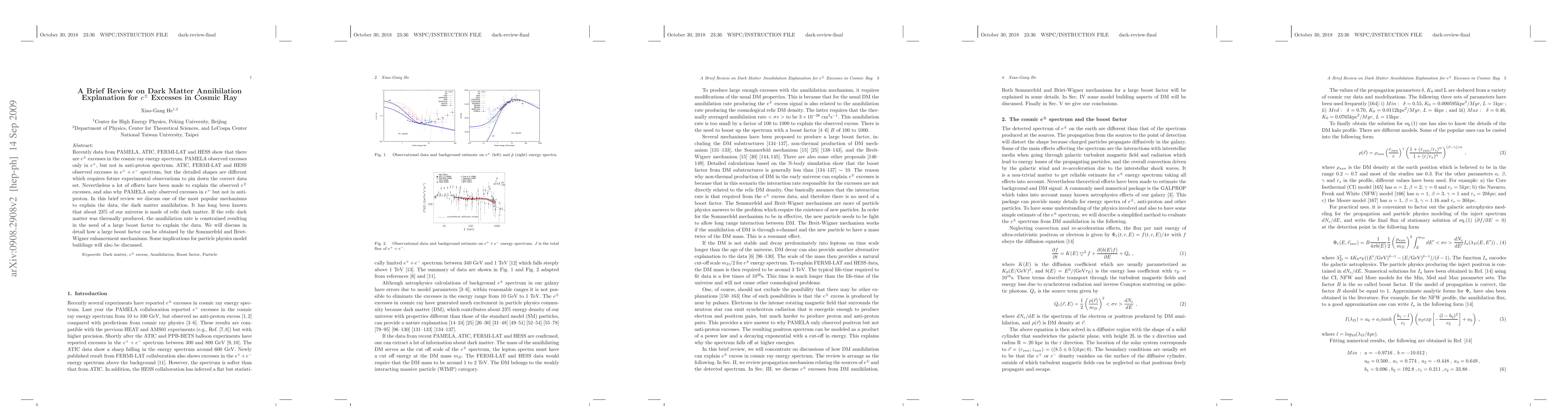This paper reviews the dark matter annihilation mechanism as a potential explanation for observed $e^\pm$ excesses in cosmic rays, noting discrepancies in data from various experiments and discussing the Sommerfeld and Briet-Wigner enhancement mechanisms for achieving a large boost factor. Implications for particle physics models are also considered.