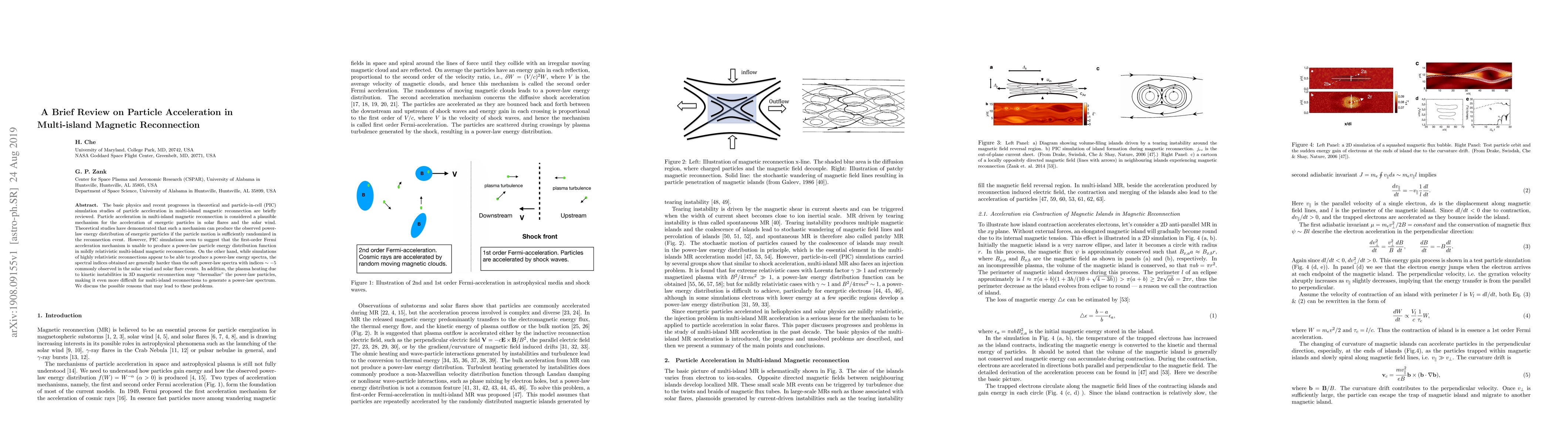 This paper reviews theoretical and simulation studies on particle acceleration in multi-island magnetic reconnection, highlighting its potential as a mechanism for energetic particles in solar flares. Despite theoretical support, simulations suggest difficulties in producing the observed power-law energy distribution, especially in mildly relativistic reconnections.