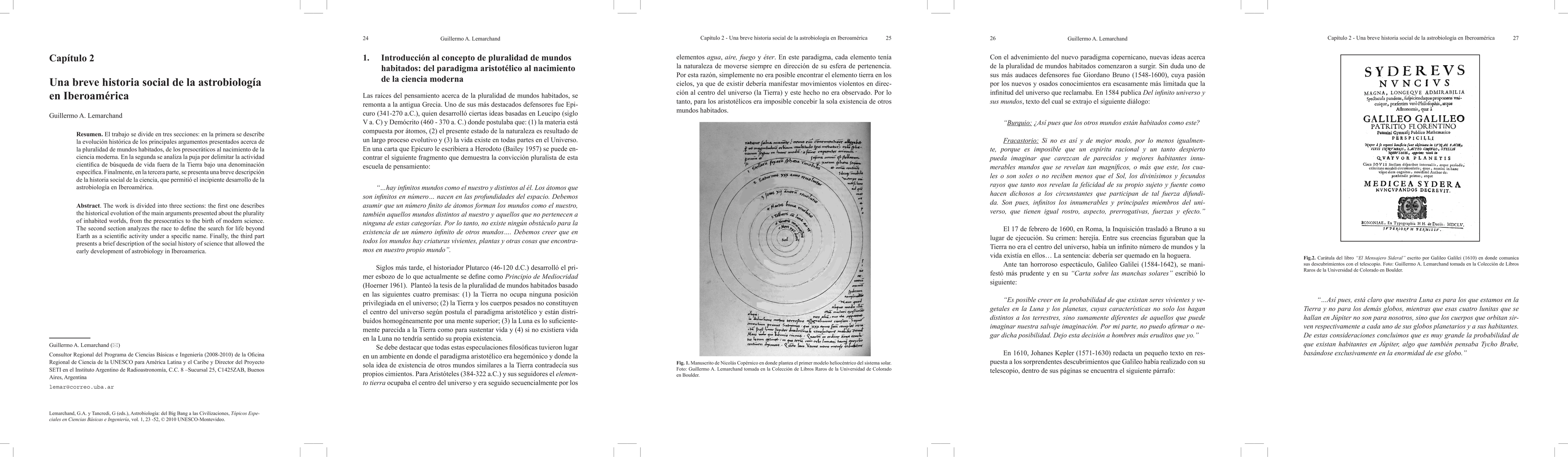 The work is divided into three sections: the first one describes the historical evolution of the main arguments presented about the plurality of inhabited worlds, from the presocratics to the birth of modern science. The second section analyzes the race to define the search for life beyond Earth as a scientific activity under a specific name. Finally, the third part presents a brief description of the social history of science that allowed the early development of astrobiology in Iberoamerica.