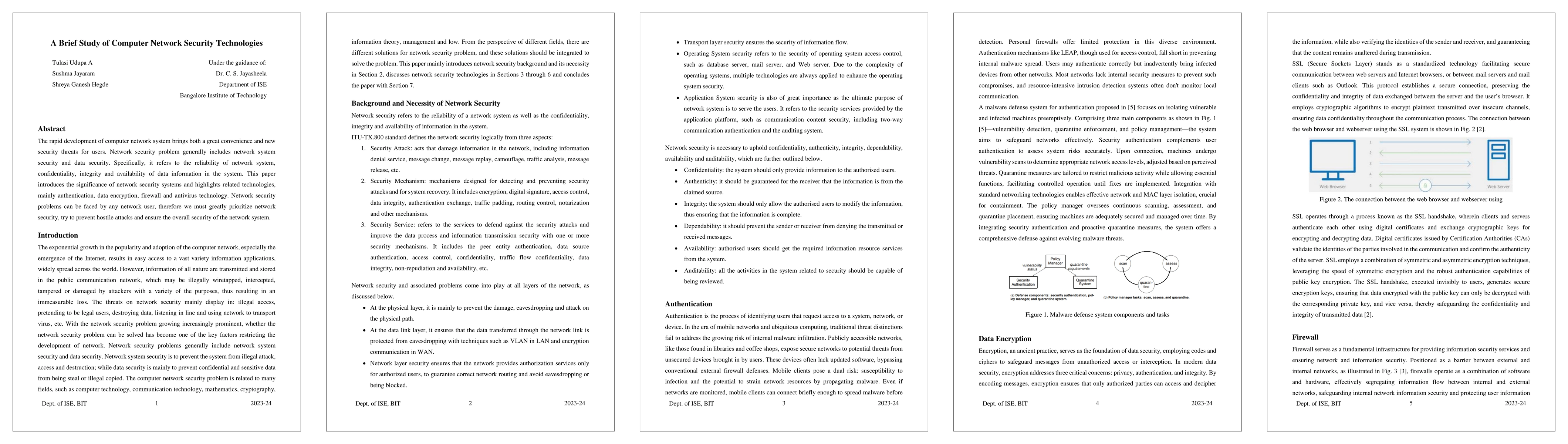 This paper examines the importance of network security in the context of rapidly developing computer networks, emphasizing the significance of technologies like authentication, data encryption, firewalls, and antivirus solutions to safeguard system reliability, data confidentiality, integrity, and availability. Prioritizing network security is crucial to fend off hostile attacks and maintain overall system safety.
