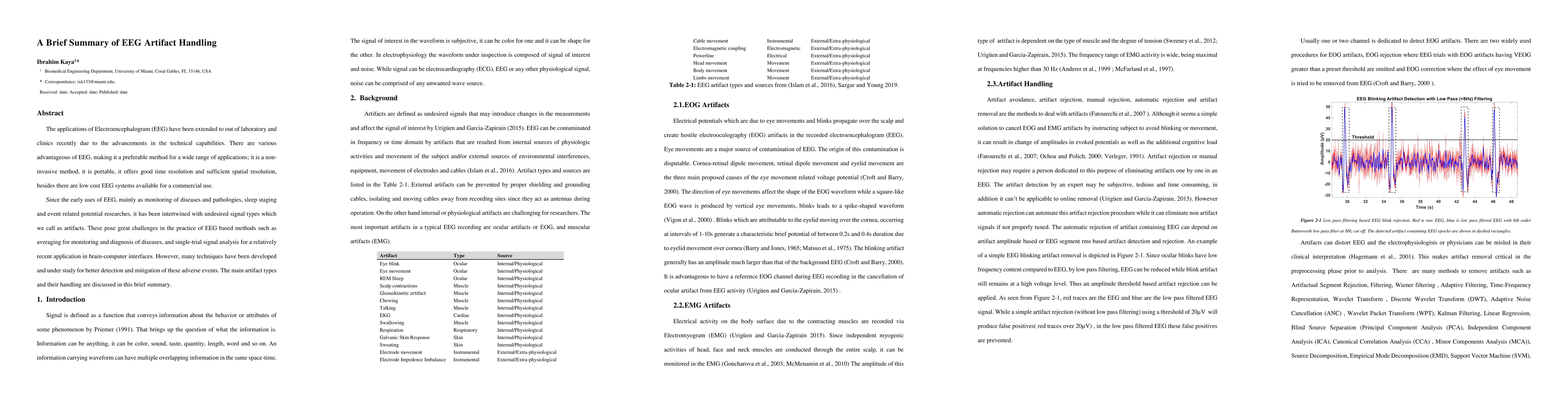 EEG research has developed techniques to handle unwanted signals called artifacts, which can interfere with brain-computer interfaces and disease diagnosis. The paper discusses main artifact types and handling methods to improve EEG-based applications.