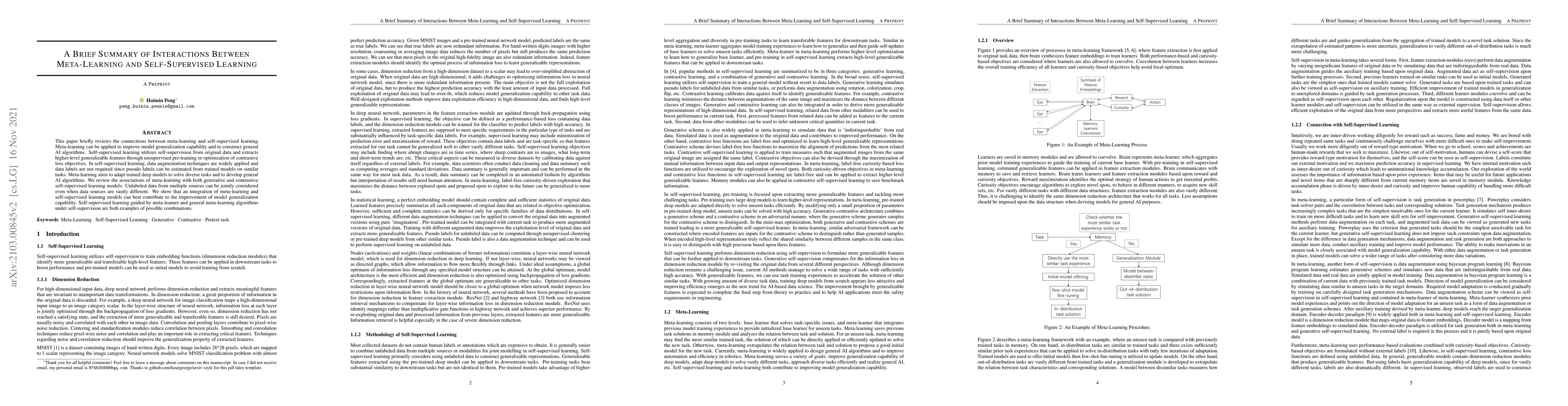 This paper briefly reviews the connections between meta-learning and self-supervised learning. Meta-learning can be applied to improve model generalization capability and to construct general AI algorithms. Self-supervised learning utilizes self-supervision from original data and extracts higher-level generalizable features through unsupervised pre-training or optimization of contrastive loss objectives. In self-supervised learning, data augmentation techniques are widely applied and data labels are not required since pseudo labels can be estimated from trained models on similar tasks. Meta-learning aims to adapt trained deep models to solve diverse tasks and to develop general AI algorithms. We review the associations of meta-learning with both generative and contrastive self-supervised learning models. Unlabeled data from multiple sources can be jointly considered even when data sources are vastly different. We show that an integration of meta-learning and self-supervised learning models can best contribute to the improvement of model generalization capability. Self-supervised learning guided by meta-learner and general meta-learning algorithms under self-supervision are both examples of possible combinations.