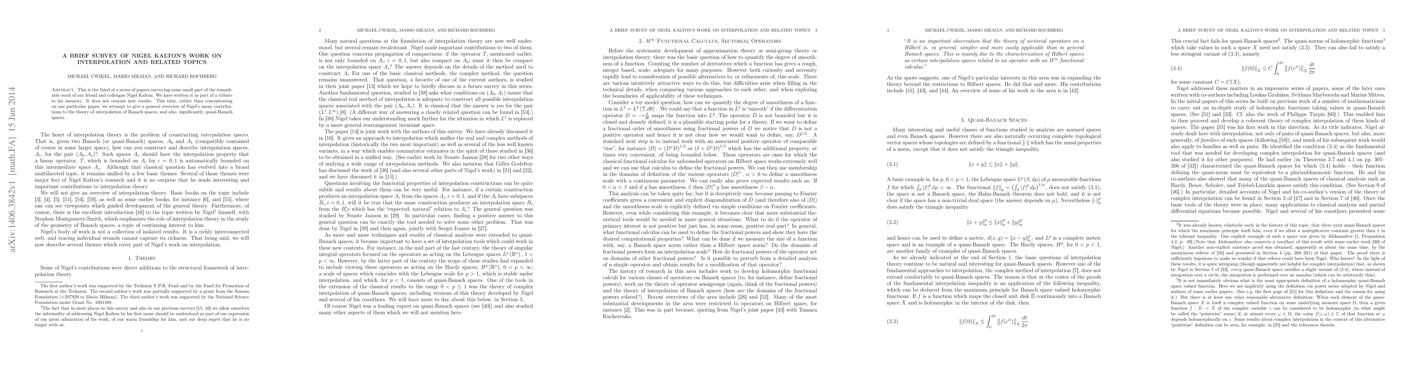 This is the third of a series of papers surveying some small part of the remarkable work of our friend and colleague Nigel Kalton. We have written it as part of a tribute to his memory. It does not contain new results. This time, rather than concentrating on one particular paper, we attempt to give a general overview of Nigel's many contributions to the theory of interpolation of Banach spaces, and also, significantly, quasi-Banach spaces.