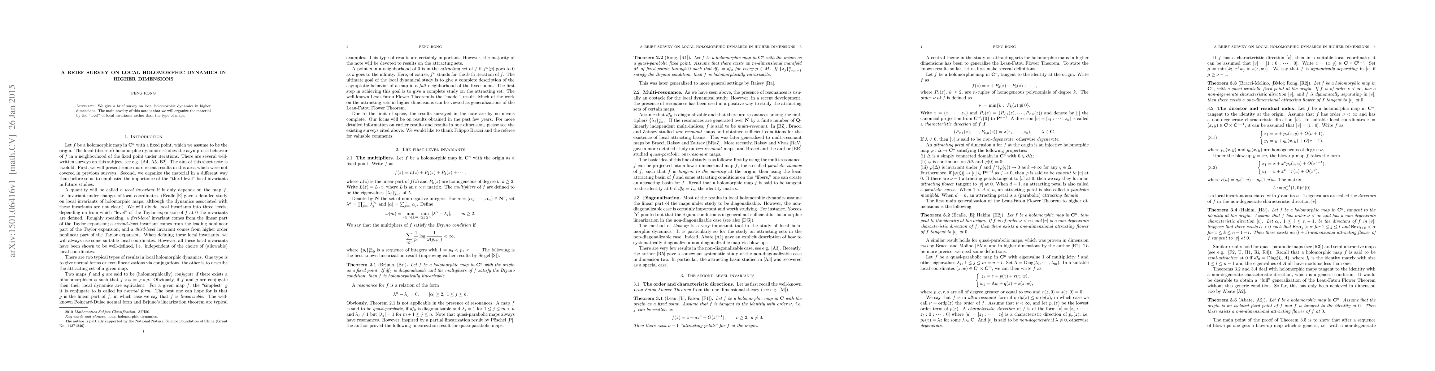 We give a brief survey on local holomorphic dynamics in higher dimensions. The main novelty of this note is that we will organize the material by the "level" of local invariants rather than the type of maps.
