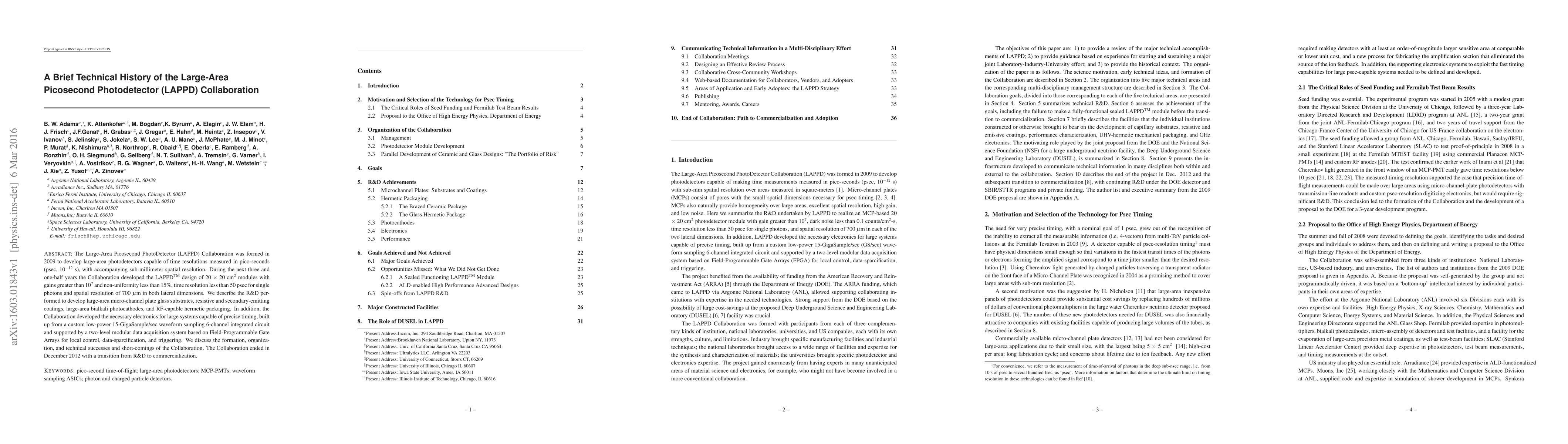 The LAPPD Collaboration developed large-area photodetectors with picosecond time resolution and sub-millimeter spatial resolution, culminating in 20 x 20 cm modules with high gain and low non-uniformity, before transitioning to commercialization in 2012. The project involved advanced R&D in micro-channel plate substrates, photocathodes, and custom electronics for precise timing.