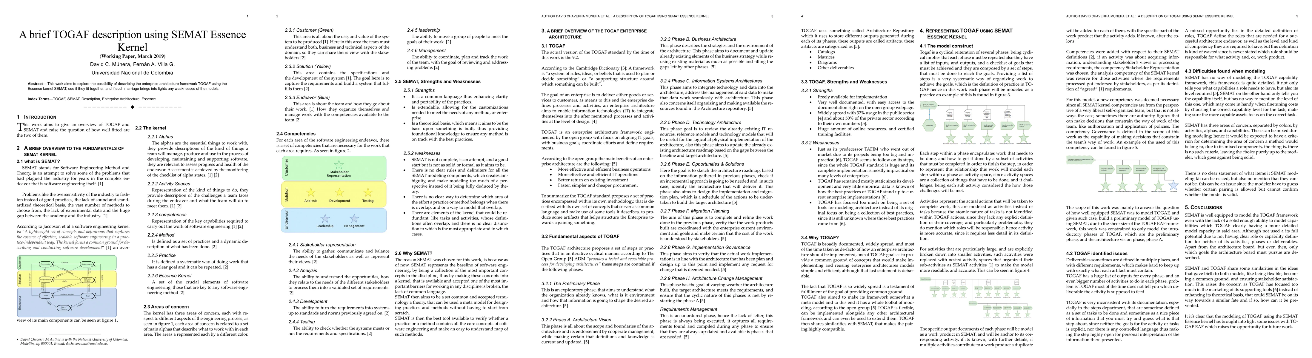This work aims to explore the possibility of describing the enterprise architecture framework TOGAF using the Essence kernel SEMAT, see if they fit together, and if such marriage brings into lights any weaknesses of the models.