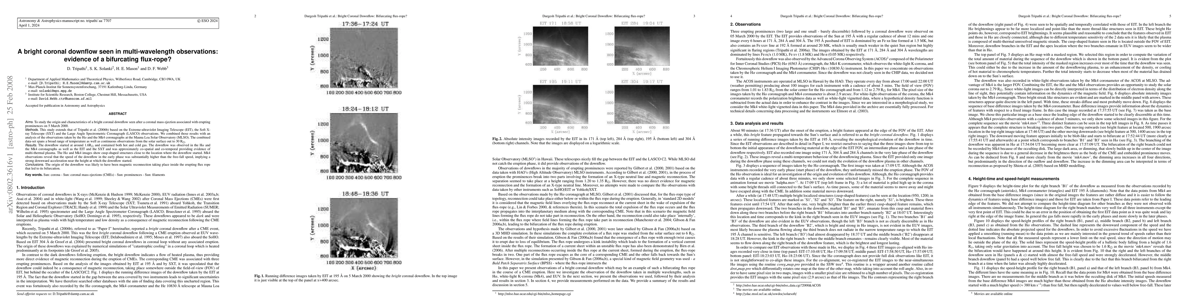 Aims: To study the origin and characteristics of a bright coronal downflow seen after a coronal mass ejection associated with erupting prominences on 5 March 2000. Methods: This study extends that of Tripathi et al. (A&A, v. 449, pp. 369) based on the Extreme-ultraviolet Imaging Telescope (EIT), the Soft X-ray Telescope (SXT) and the Large Angle Spectrometric Coronagraph (LASCO) observations. We combined those results with an analysis of the observations taken by the H${\alpha}$ and the Mk4 coronagraphs at the Mauna Loa Solar Observatory (MLSO). The combined data-set spans a broad range of temperature as well as continuous observations from the solar surface out to 30 R$_{\sun}$. Results: The downflow started at around 1.6R$_{\sun}$ and contained both hot and cold gas. The downflow was observed in the H${\alpha}$ and the Mk4 coronagraphs as well as the EIT and the SXT and was approximately co-spatial and co-temporal providing evidence of multi-thermal plasma. The H${\alpha}$ and Mk4 images show cusp-shaped structures close to the location where the downflow started. Mk4 observations reveal that the speed of the downflow in the early phase was substantially higher than the free-fall speed, implying a strong downward acceleration near the height at which the downflow started. Conclusions: The origin of the downflow was likely to have been magnetic reconnection taking place inside the erupting flux rope that led to its bifurcation.