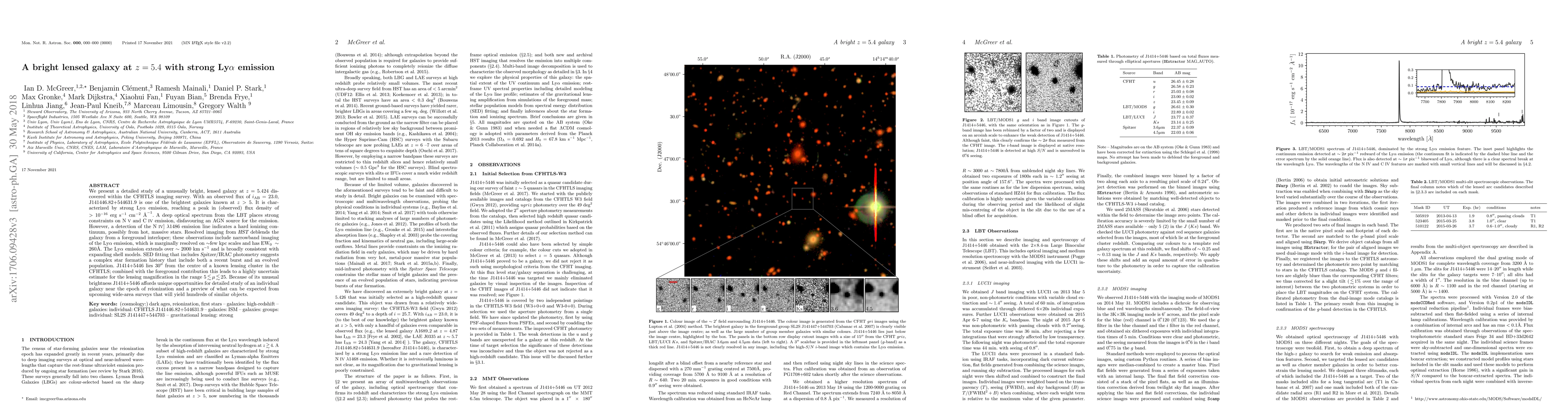 We present a detailed study of a unusually bright, lensed galaxy at $z=5.424$ discovered within the CFHTLS imaging survey. With an observed flux of $i_{\rm AB}=23.0$, J141446.82+544631.9 is one of the brightest galaxies known at $z>5$. It is characterized by strong Ly$\alpha$ emission, reaching a peak in (observed) flux density of $>10^{-16}~{\rm erg}~{\rm s}^{-1}~{\rm cm}^{-2}~{\rm \AA}^{-1}$. A deep optical spectrum from the LBT places strong constraints on NV and CIV emission, disfavouring an AGN source for the emission. However, a detection of the NIV]~$\lambda$1486 emission line indicates a hard ionizing continuum, possibly from hot, massive stars. Resolved imaging from HST deblends the galaxy from a foreground interloper; these observations include narrowband imaging of the Ly$\alpha$ emission, which is marginally resolved on $\sim$few~kpc scales and has EW$_0~\sim$ 260\AA. The Ly$\alpha$ emission extends over ~2000~${\rm km}~{\rm s}^{-1}$ and is broadly consistent with expanding shell models. SED fitting that includes Spitzer/IRAC photometry suggests a complex star formation history that include both a recent burst and an evolved population. J1414+5446 lies 30" from the centre of a known lensing cluster in the CFHTLS; combined with the foreground contribution this leads to a highly uncertain estimate for the lensing magnification in the range $5 \leq \mu \leq 25$. Because of its unusual brightness J1414+5446 affords unique opportunities for detailed study of an individual galaxy near the epoch of reionization and a preview of what can be expected from upcoming wide-area surveys that will yield hundreds of similar objects.