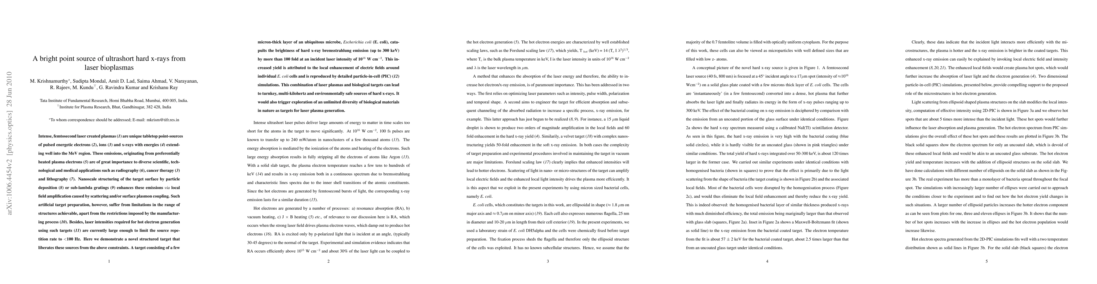 Micro and nano structures scatter light and amplify local electric fields very effectively. Energy incident as intense ultrashort laser pulses can be converted to x-rays and hot electrons more efficiently with a substrate that suitably modifies the local fields. Here we demonstrate that coating a plain glass surface with a few micron thick layer of an ubiquitous microbe, {\it Escherichia coli}, catapults the brightness of hard x-ray bremsstrahlung emission (up to 300 keV) by more than two orders of magnitude at an incident laser intensity of 10$^{16}$ W cm$^{-2}$. This increased yield is attributed to the local enhancement of electric fields around individual {\it E. coli} cells and is reproduced by detailed particle-in-cell (PIC) simulations. This combination of laser plasmas and biological targets can lead to turnkey, multi-kilohertz and environmentally safe sources of hard x-rays.