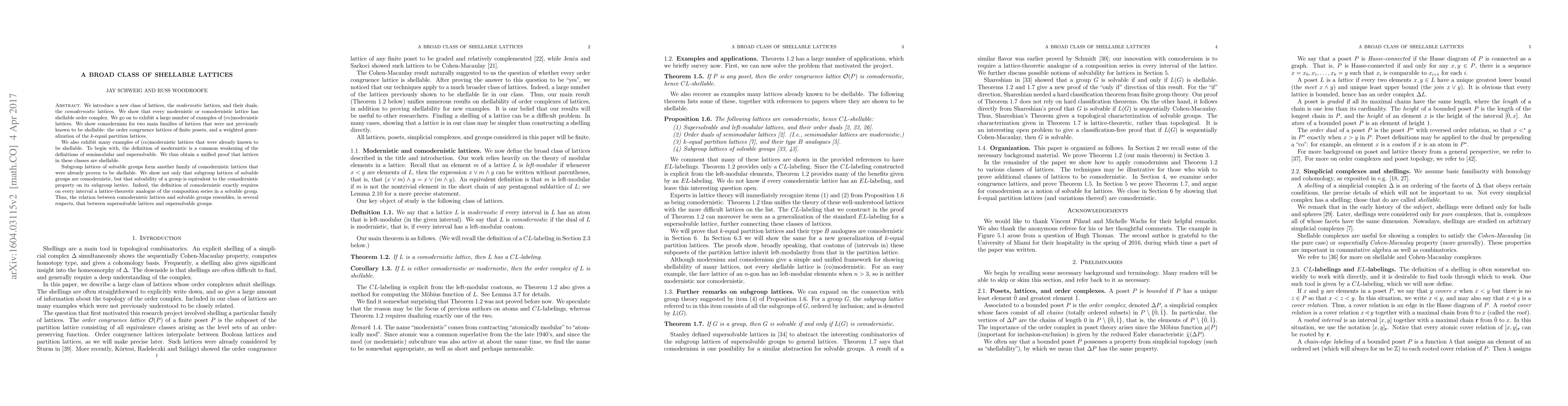 We introduce a new class of lattices, the modernistic lattices, and their duals, the comodernistic lattices. We show that every modernistic or comodernistic lattice has shellable order complex. We go on to exhibit a large number of examples of (co)modernistic lattices. We show comodernism for two main families of lattices that were not previously known to be shellable: the order congruence lattices of finite posets, and a weighted generalization of the k-equal partition lattices. We also exhibit many examples of (co)modernistic lattices that were already known to be shellable. To start with, the definition of modernistic is a common weakening of the definitions of semimodular and supersolvable. We thus obtain a unified proof that lattice in these classes are shellable. Subgroup lattices of solvable groups form another family of comodernistic lattices that were already proved to be shellable. We show not only that subgroup lattices of solvable groups are comodernistic, but that solvability of a group is equivalent to the comodernistic property on its subgroup lattice. Indeed, the definition of comodernistic exactly requires on every interval a lattice-theoretic analogue of the composition series in a solvable group. Thus, the relation between comodernistic lattices and solvable groups resembles, in several respects, that between supersolvable lattices and supersolvable groups.