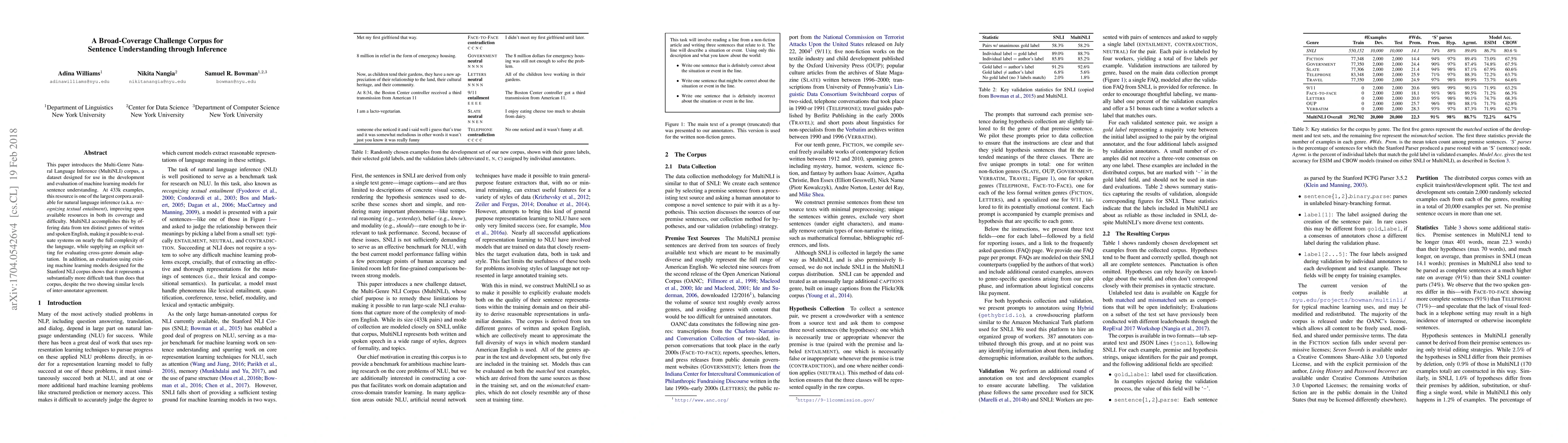 This paper presents the Multi-Genre Natural Language Inference (MultiNLI) corpus, a large dataset of 433k examples for developing and evaluating sentence understanding models. It covers ten distinct genres, enhancing the evaluation of cross-genre domain adaptation and the complexity of natural language.
