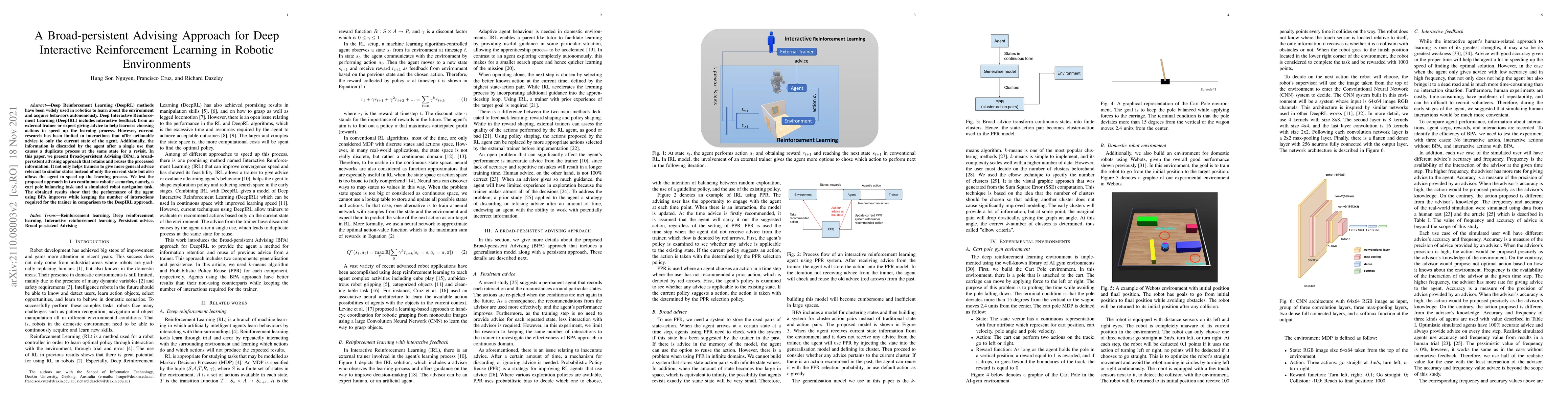 This paper introduces Broad-persistent Advising (BPA), a method for Deep Interactive Reinforcement Learning that retains and reuses advice from trainers to improve the learning process. BPA allows trainers to provide more general advice and reduces the need for repetitive interactions, enhancing performance in robotic tasks like cart pole balancing and navigation.