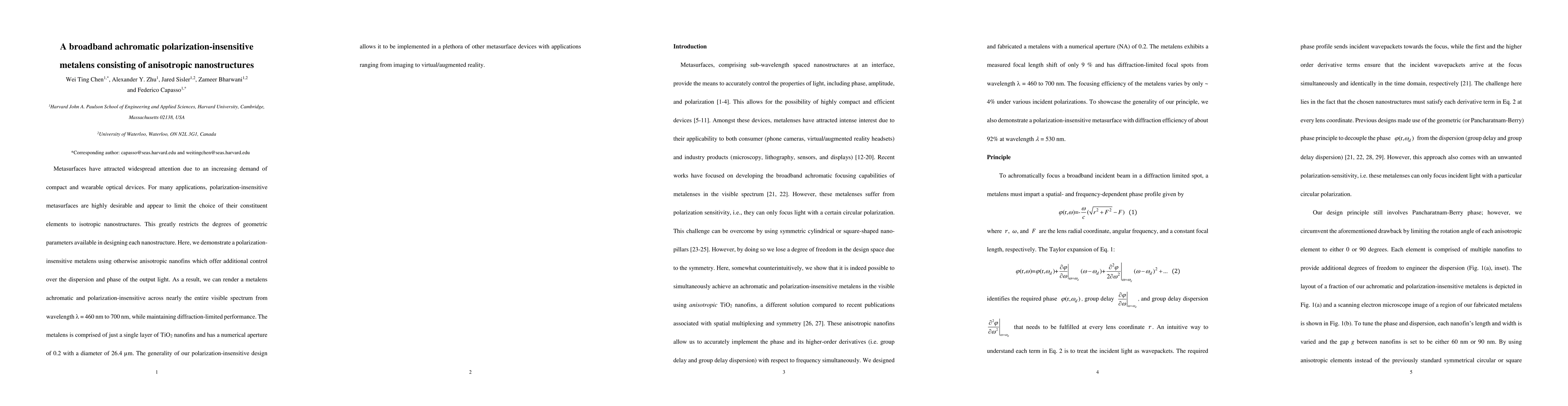 The proposed design approach overcomes the limitations of isotropic nanostructures, enabling a broader range of geometric parameters for metasurface design and achieving achromatic, polarization-insensitive metalenses.