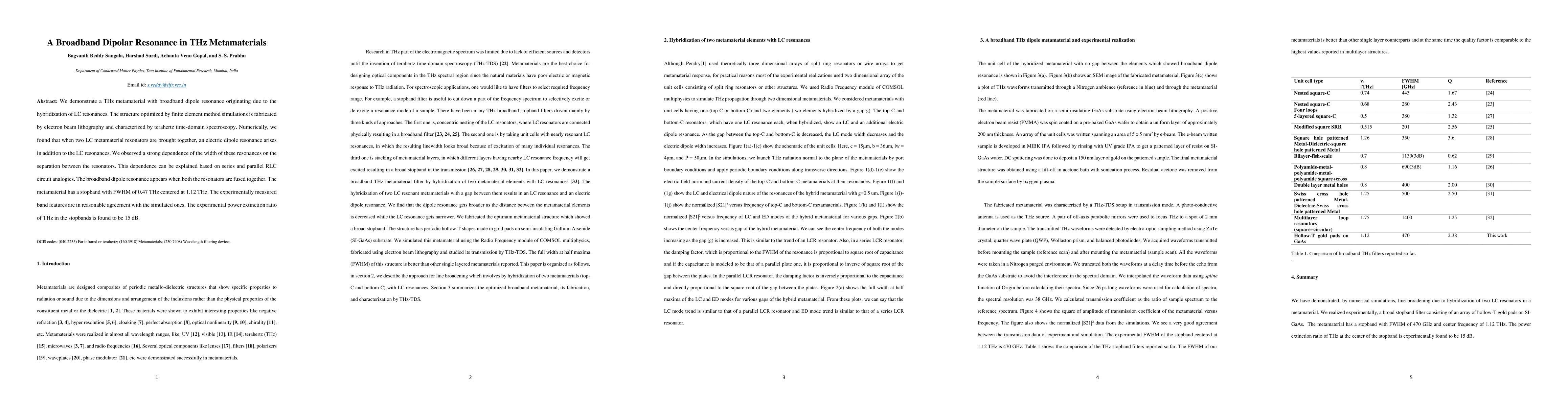 We demonstrate a THz metamaterial with broadband dipole resonance originating due to the hybridization of LC resonances. The structure optimized by finite element method simulations is fabricated by electron beam lithography and characterized by terahertz time-domain spectroscopy. Numerically, we found that when two LC metamaterial resonators are brought together, an electric dipole resonance arises in addition to the LC resonances. We observed a strong dependence of the width of these resonances on the separation between the resonators. This dependence can be explained based on series and parallel RLC circuit analogies. The broadband dipole resonance appears when both the resonators are fused together. The metamaterial has a stopband with FWHM of 0.47 THz centered at 1.12 THz. The experimentally measured band features are in reasonable agreement with the simulated ones. The experimental power extinction ratio of THz in the stopbands is found to be 15 dB.