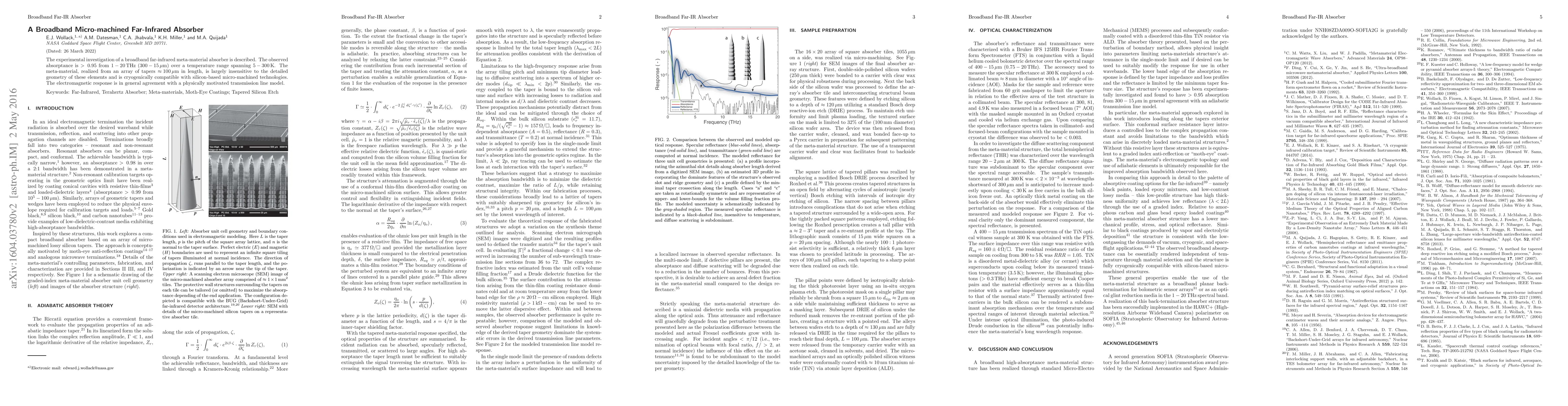 The experimental investigation of a broadband far-infrared meta-material absorber is described. The observed absorptance is $>\,0.95$ from ${\rm 1-20\,THz}$ (${\rm 300-15\,\mu m}$) over a temperature range spanning ${\rm 5-300\,K}$. The meta-material, realized from an array of tapers ${\rm \approx 100\,\mu m}$ in length, is largely insensitive to the detailed geometry of these elements and is cryogenically compatible with silicon-based micro-machined technologies. The electromagnetic response is in general agreement with a physically motivated transmission line model.