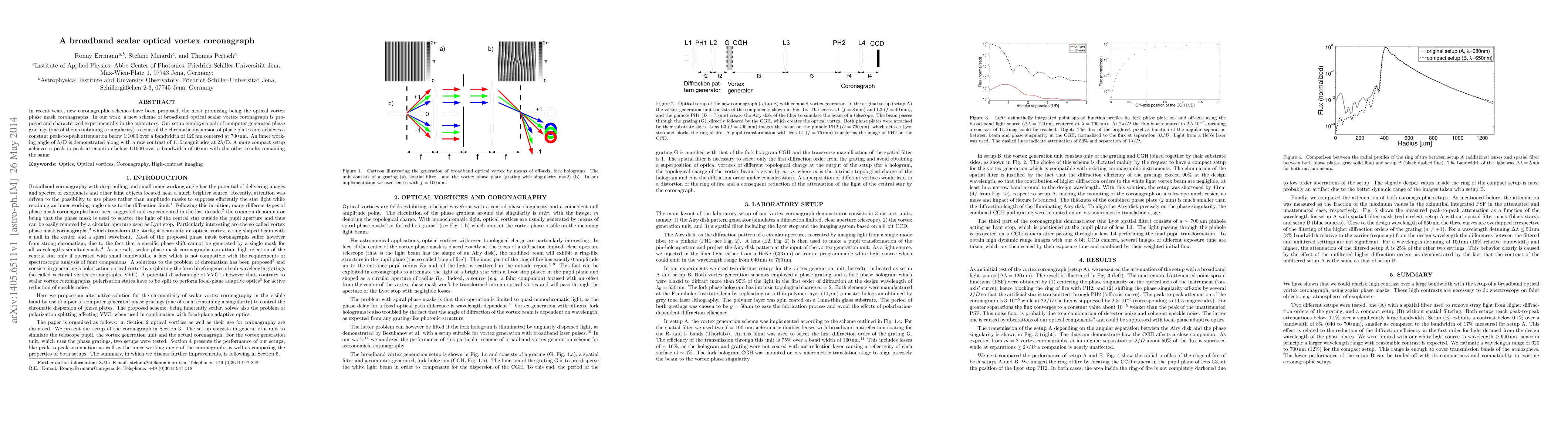 In recent years, new coronagraphic schemes have been proposed, the most promising being the optical vortex phase mask coronagraphs. In our work, a new scheme of broadband optical scalar vortex coronagraph is proposed and characterized experimentally in the laboratory. Our setup employs a pair of computer generated phase gratings (one of them containing a singularity) to control the chromatic dispersion of phase plates and achieves a constant peak-to-peak attenuation below 1:1000 over a bandwidth of 120 nm centered at 700 nm. An inner working angle of $\lambda$/D is demonstrated along with a raw contrast of 11.5\,magnitudes at 2$\lambda$/D. A more compact setup achieves a peak-to-peak attenuation below 1:1000 over a bandwidth of 60 nm with the other results remaining the same.